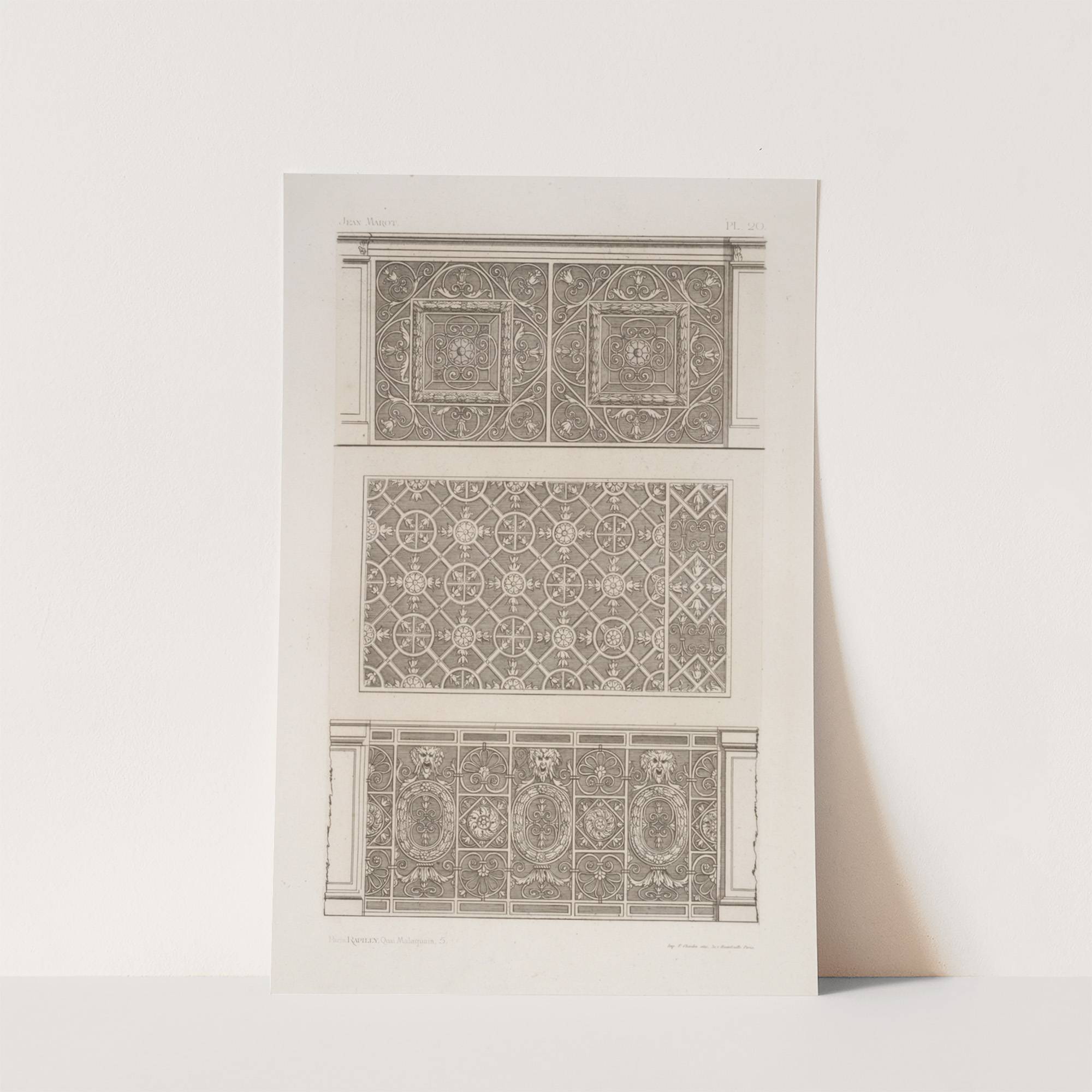 This exquisite set of three intricate pattern designs is presented in monochromatic detail, inspired by the classic work of André-Charles Boulle. Each piece showcases elaborate metalwork motifs, meticulously rendered to highlight the elegance and craftsmanship associated with this historical artist.The...