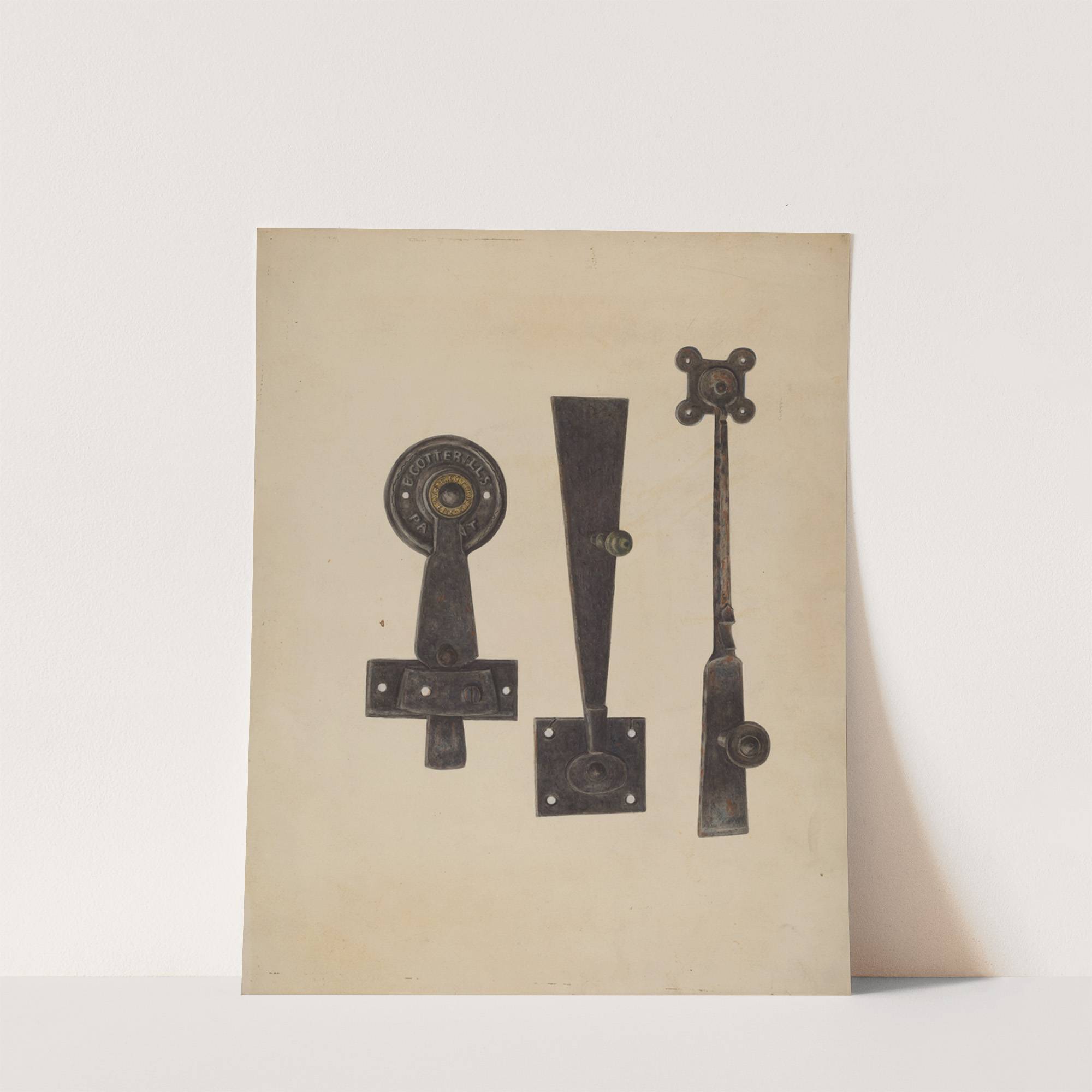 This art print features three vintage-style mechanical latch components meticulously illustrated in a monochromatic palette of deep black against an off-white background. The leftmost component resembles a circular keyhole cover with rounded edges, displaying intricate detailing around the central hole....