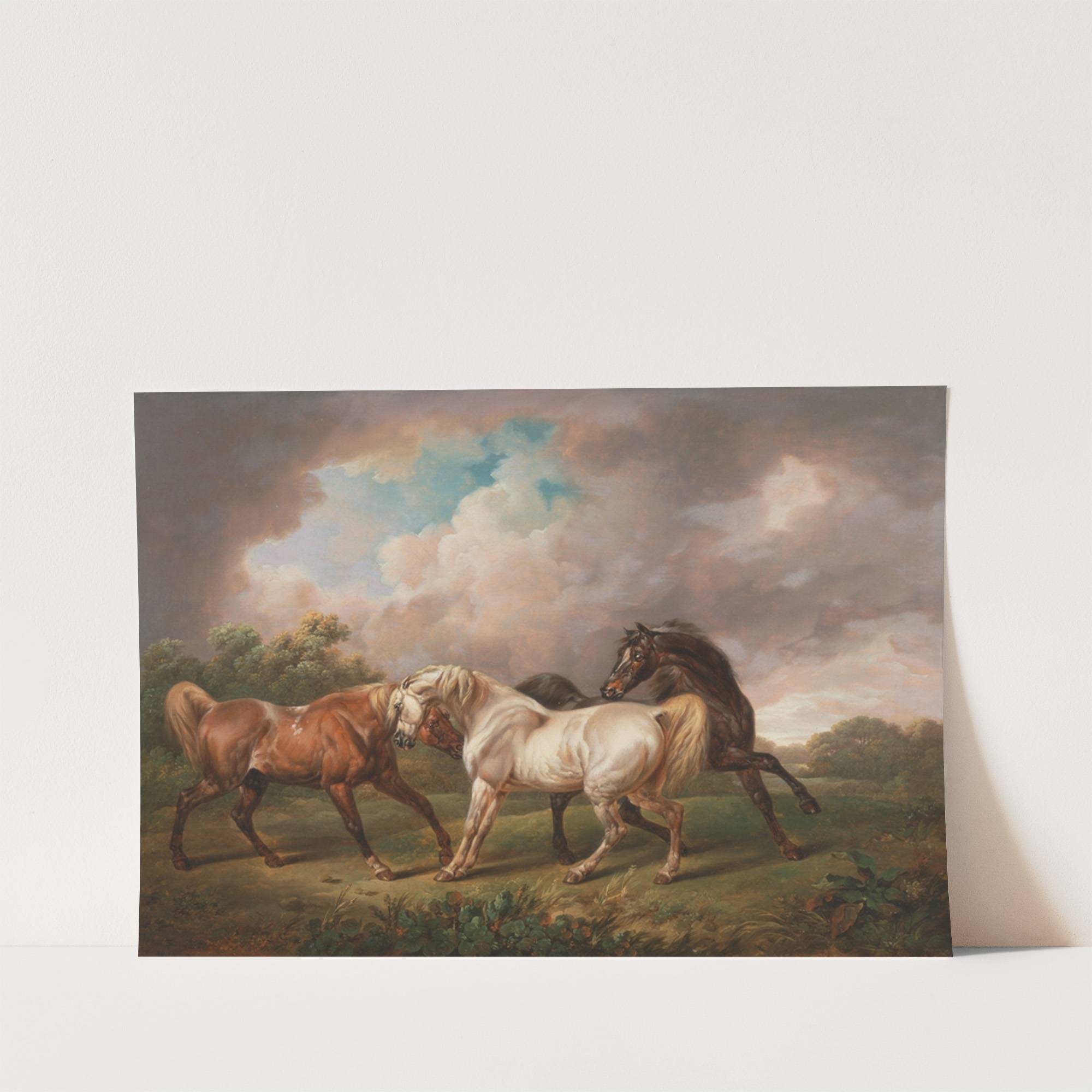 Experience the majestic beauty of nature with "Three Horses in a Stormy Landscape" by Charles Towne. This stunning painting captures three horses galloping through a verdant meadow under a dramatic sky filled with swirling clouds. The trio features an elegant...