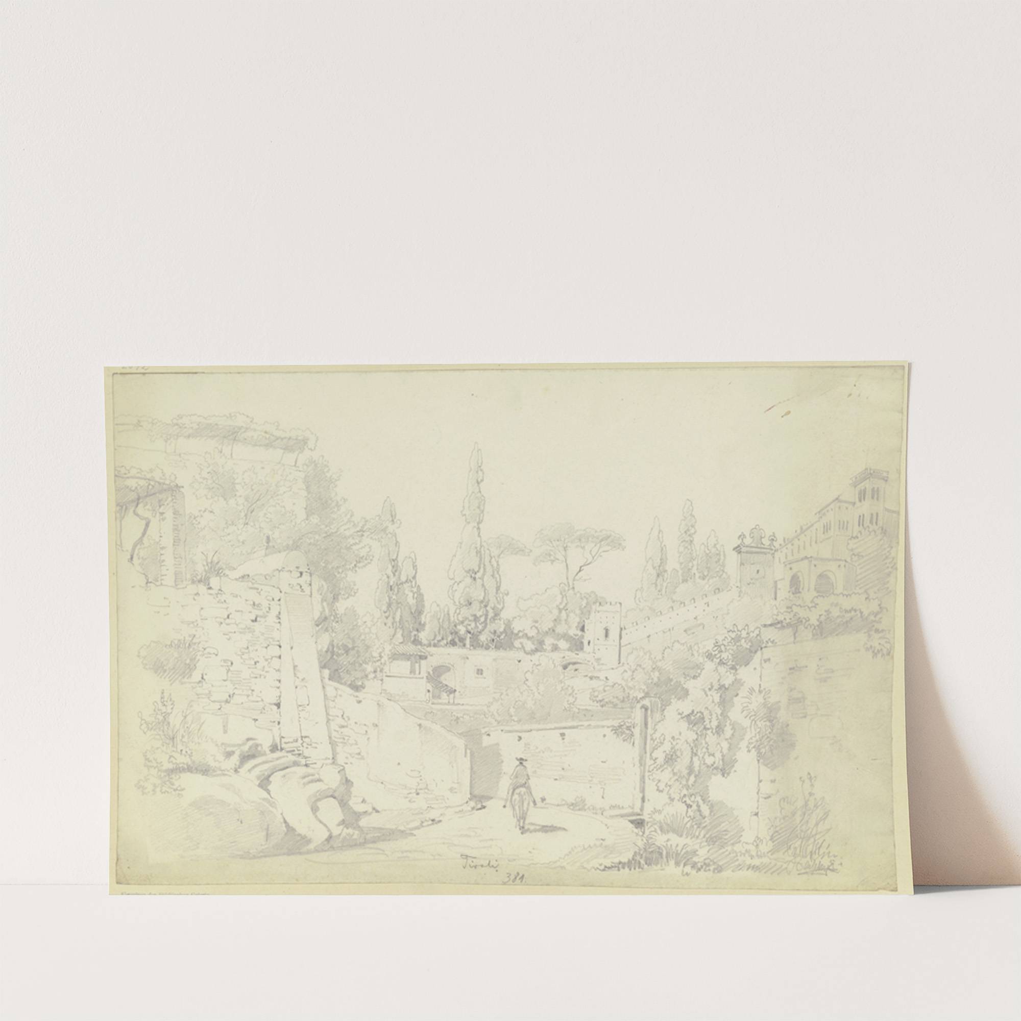 This elegant art print features "Tivoli" by renowned artist Adolf Höffler. The monochromatic sketch-style illustration showcases a serene outdoor scene with delicate, fine-line details in grayscale. Central to the composition is a simple wooden structure or small building, slightly to...