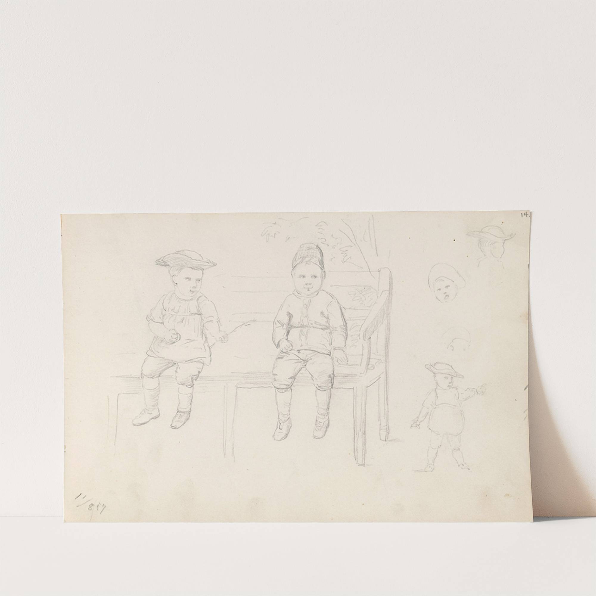 This minimalist line drawing captures a quiet, contemplative moment featuring three children seated on a bench. The sketch is rendered in delicate pencil strokes with an emphasis on simplicity and realism. On the left, one child sits upright, head slightly...