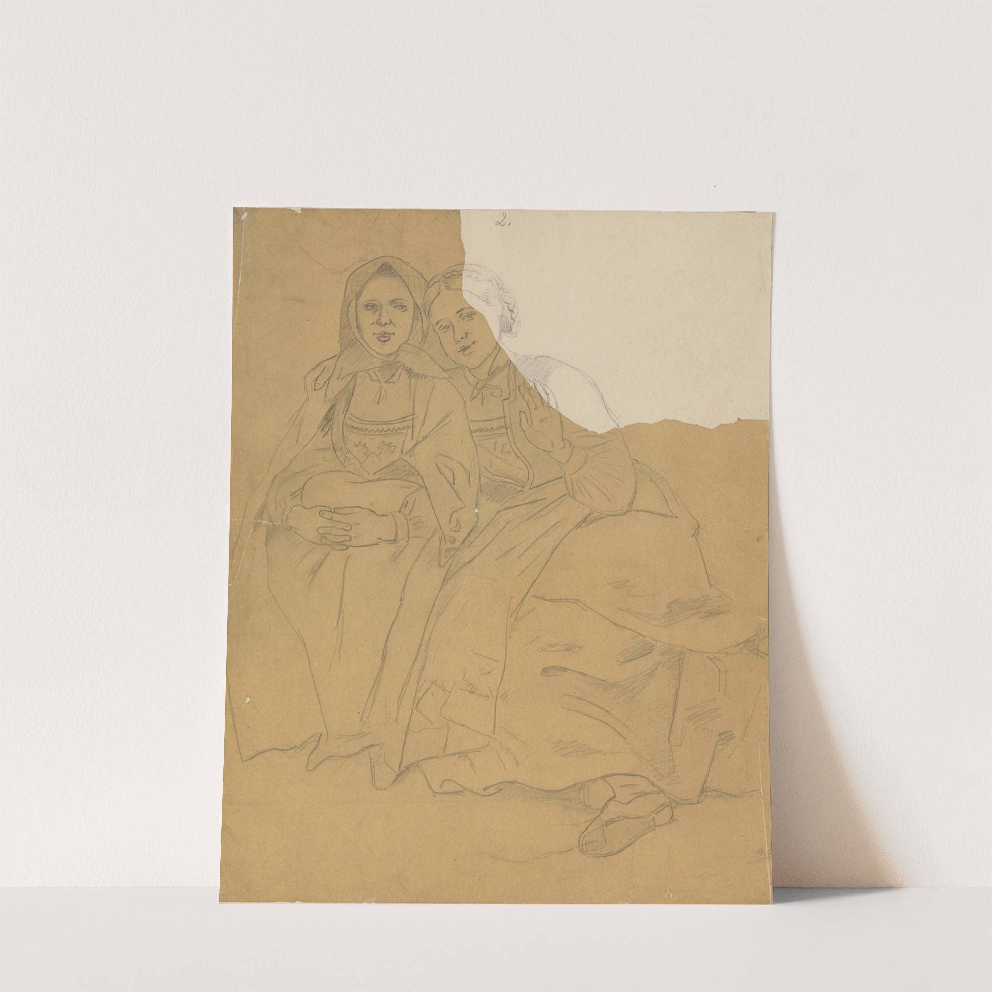 This art print features "To sittende bundskledde jenter" (1869) by Adolph Tidemand, rendered in soft pencil on a beige-toned paper background. The artwork presents two young women sitting closely together in a gentle, almost protective embrace. The woman on the...