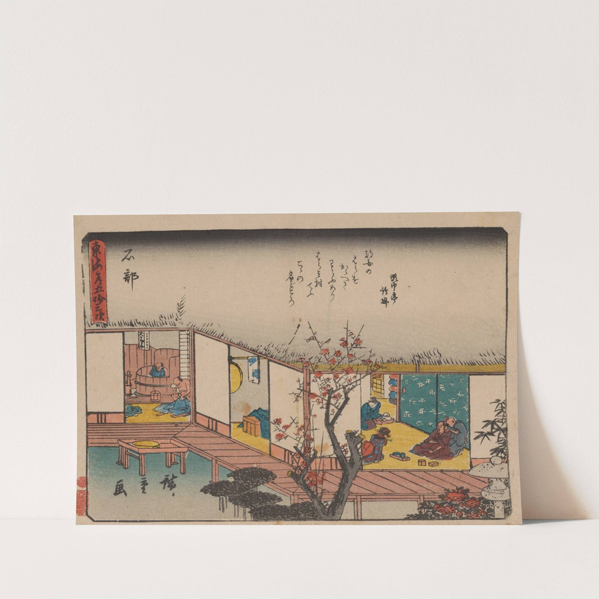 This captivating print is titled "Pl.52" from the series "Tokaido Gojusantsugi," created by the renowned artist Andō Hiroshige. It depicts a serene and intricate scene of traditional Japanese life within a residential setting. The composition features a tranquil courtyard with...