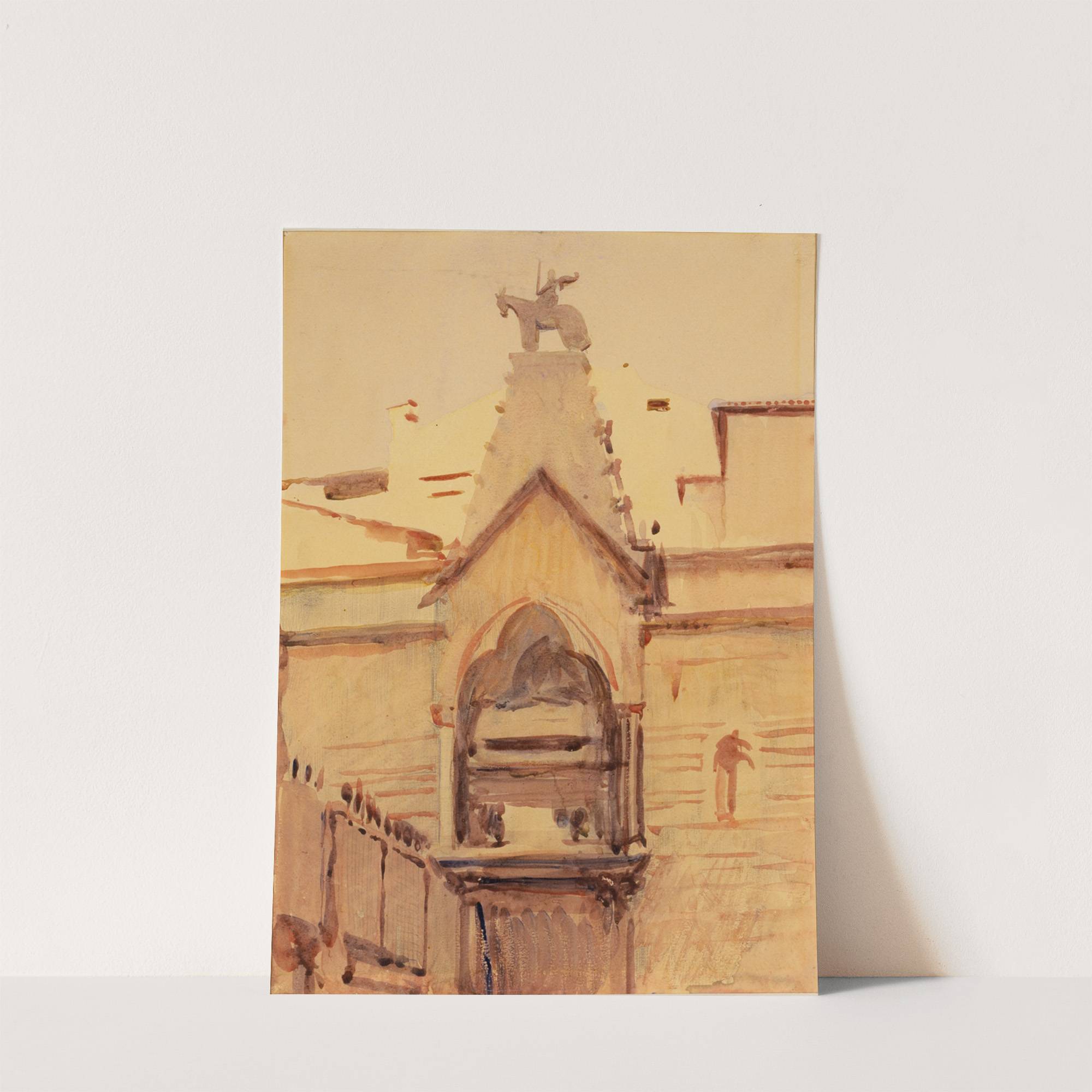 This art print features "Tomb of Verona" by Abbott Handerson Thayer, showcasing the artist's impressionistic style with loose brushstrokes. The image captures a section of an old church facade bathed in warm, golden light. The central focus is an arched...