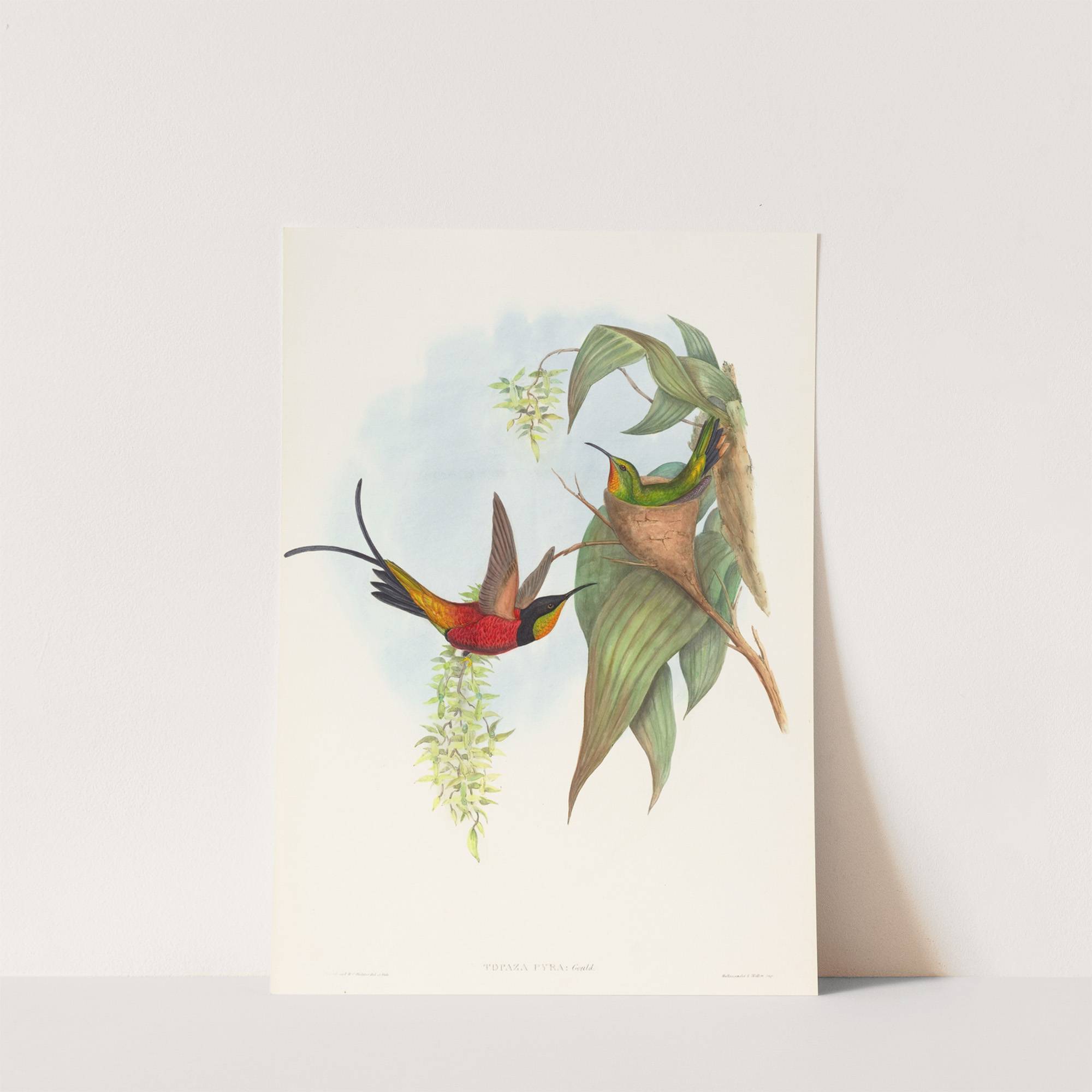 This stunning artwork depicts "Topaza pyra" by the renowned artist John Gould. The image captures a vibrant moment in nature with incredible detail and color. A strikingly vivid hummingbird, characterized by its bright red breast and yellow-orange underparts, is seen...