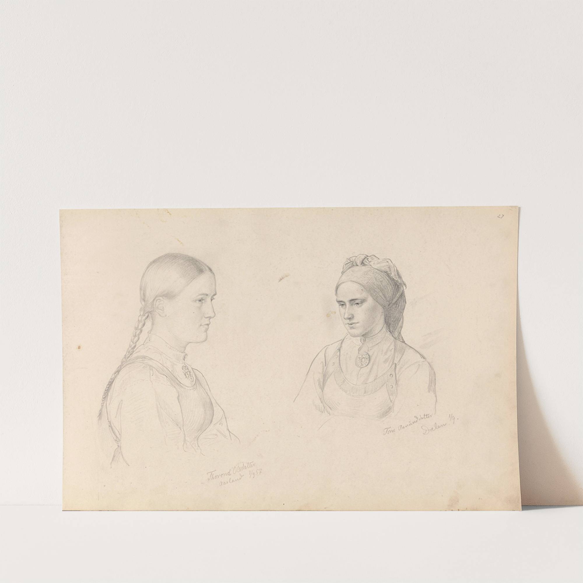 This art print features a delicate pencil sketch titled "Tone Anundsdatter (1857)" by the artist Torond Olsdatter. The drawing showcases two women, one on each side of the canvas, engaged in a moment of mutual gaze. The woman on the...