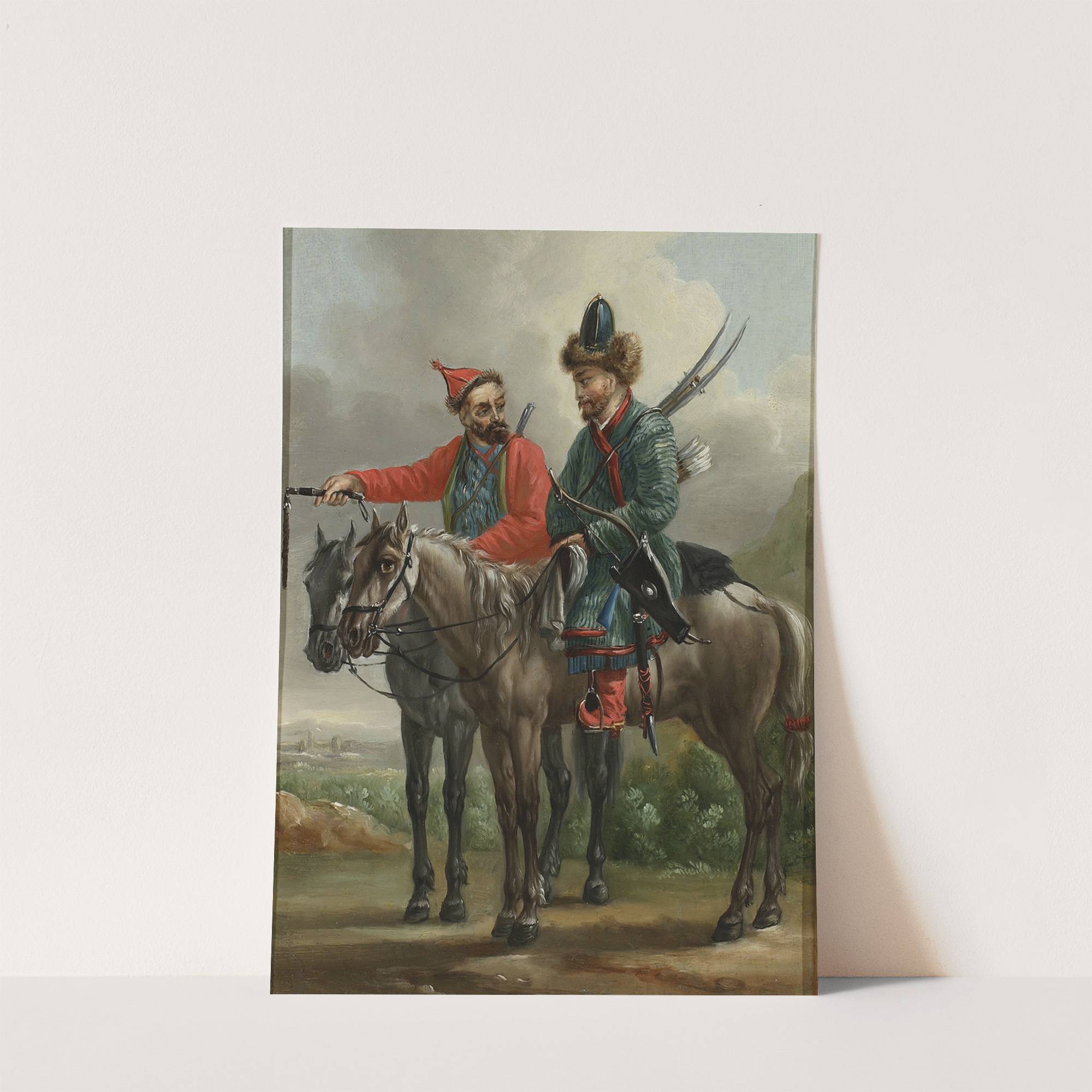 This art print features "Two Kalmyk Horsemen" by Aleksander Orłowski, a classic painting rich in cultural detail and historical significance. The two figures are depicted with striking realism, set against a backdrop of soft, earthy tones and a cloudy sky...