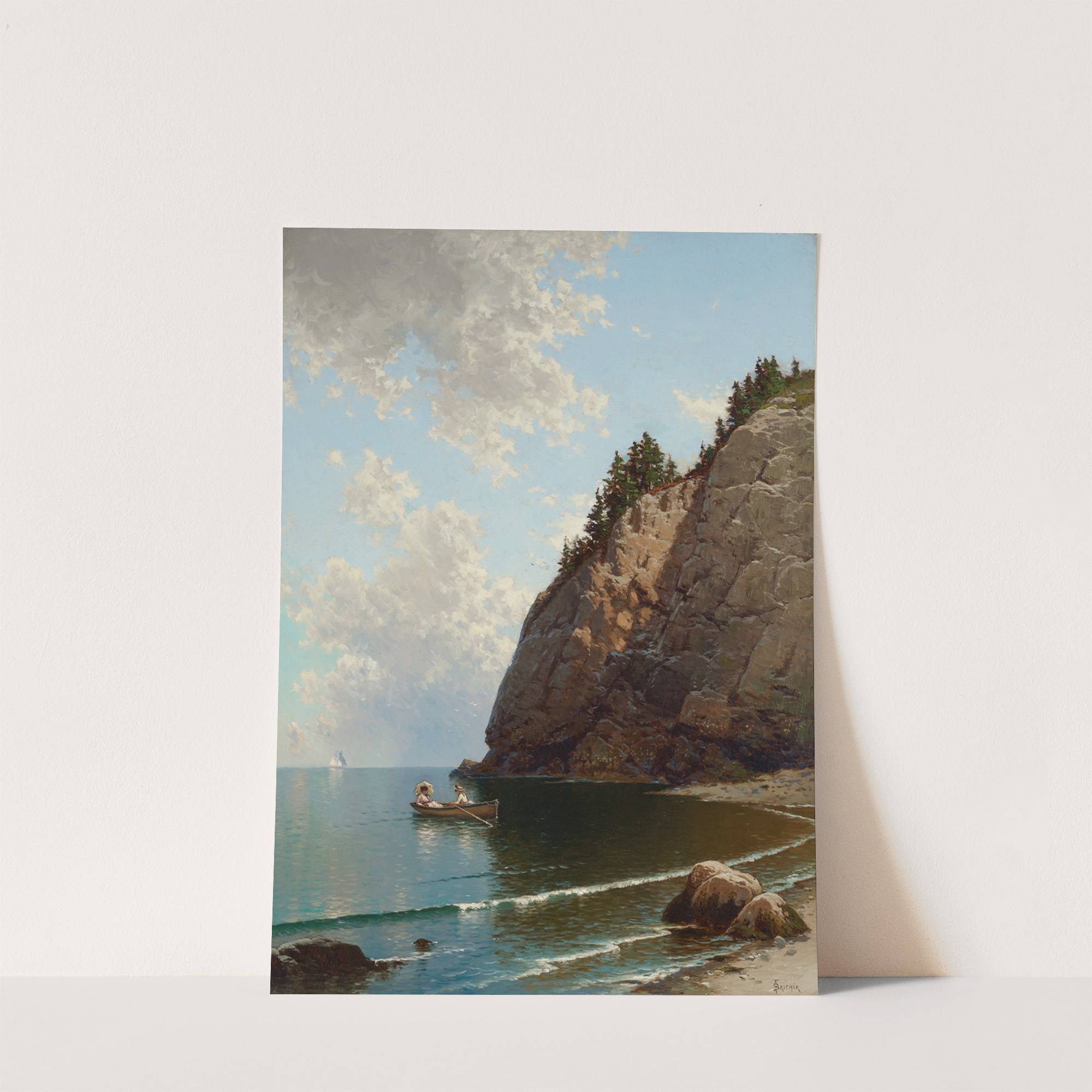 This captivating art print features "Two Ladies in a Rowboat" by Alfred Thompson Bricher, capturing the serene beauty of a coastal scene. The composition showcases a rugged cliff face with textured, weathered rock formations on the right side, covered in...