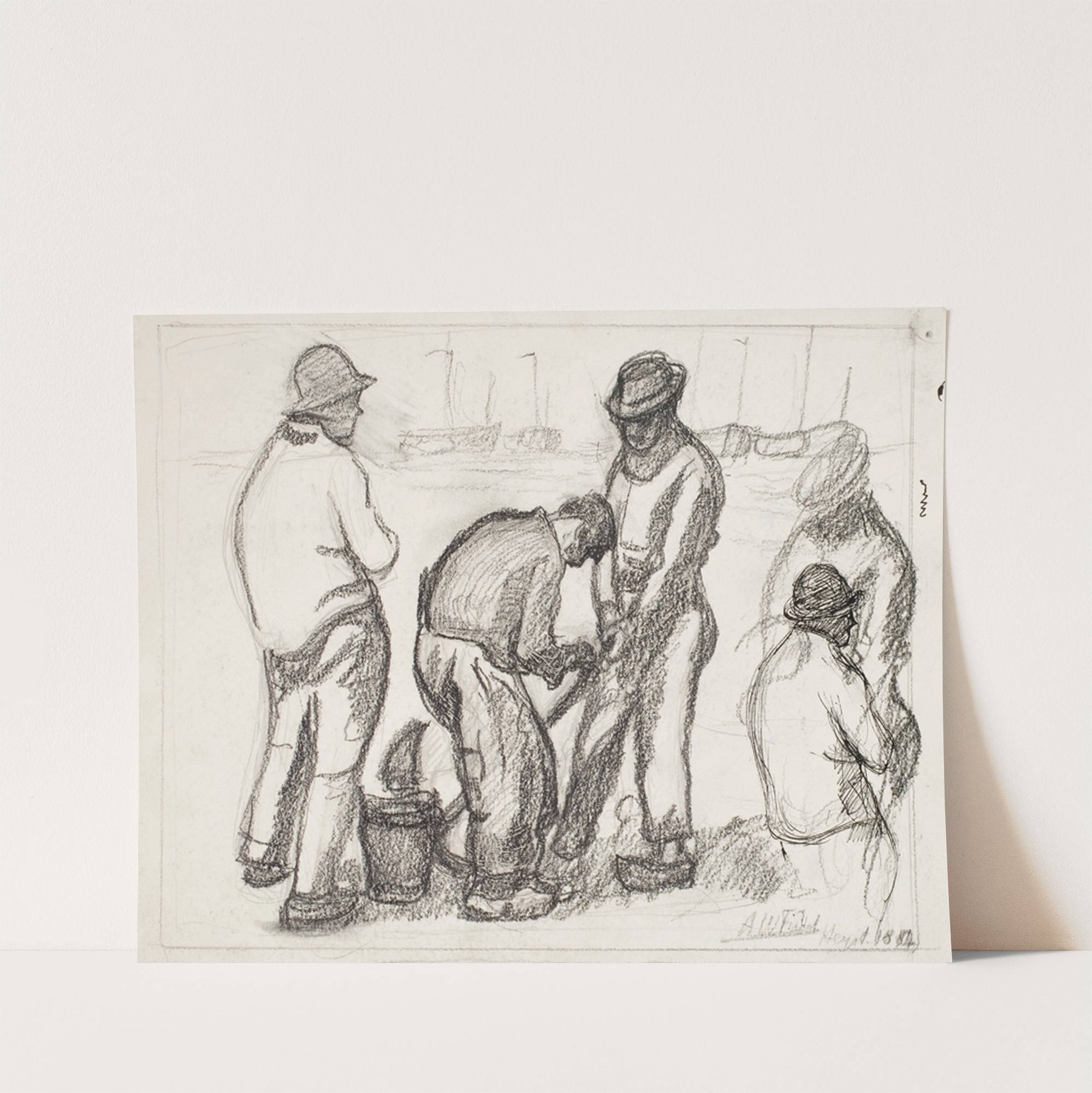 This monochromatic drawing titled "Työmiehiä" by Alfred William Finch captures a poignant moment of rural life with remarkable detail and expression. Five male workers are engaged in laborious tasks, depicted with careful, dynamic pencil strokes that convey both the effort...