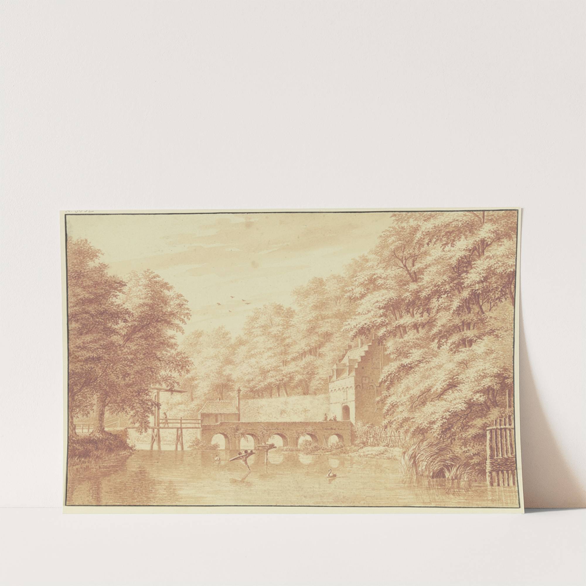 Über ein Wasser führt eine Steinbrücke von fünf Bögen nach einem Parktor, auf dem Wasser zwei Schwäne by Gerard van Rossum - Wall Art Print