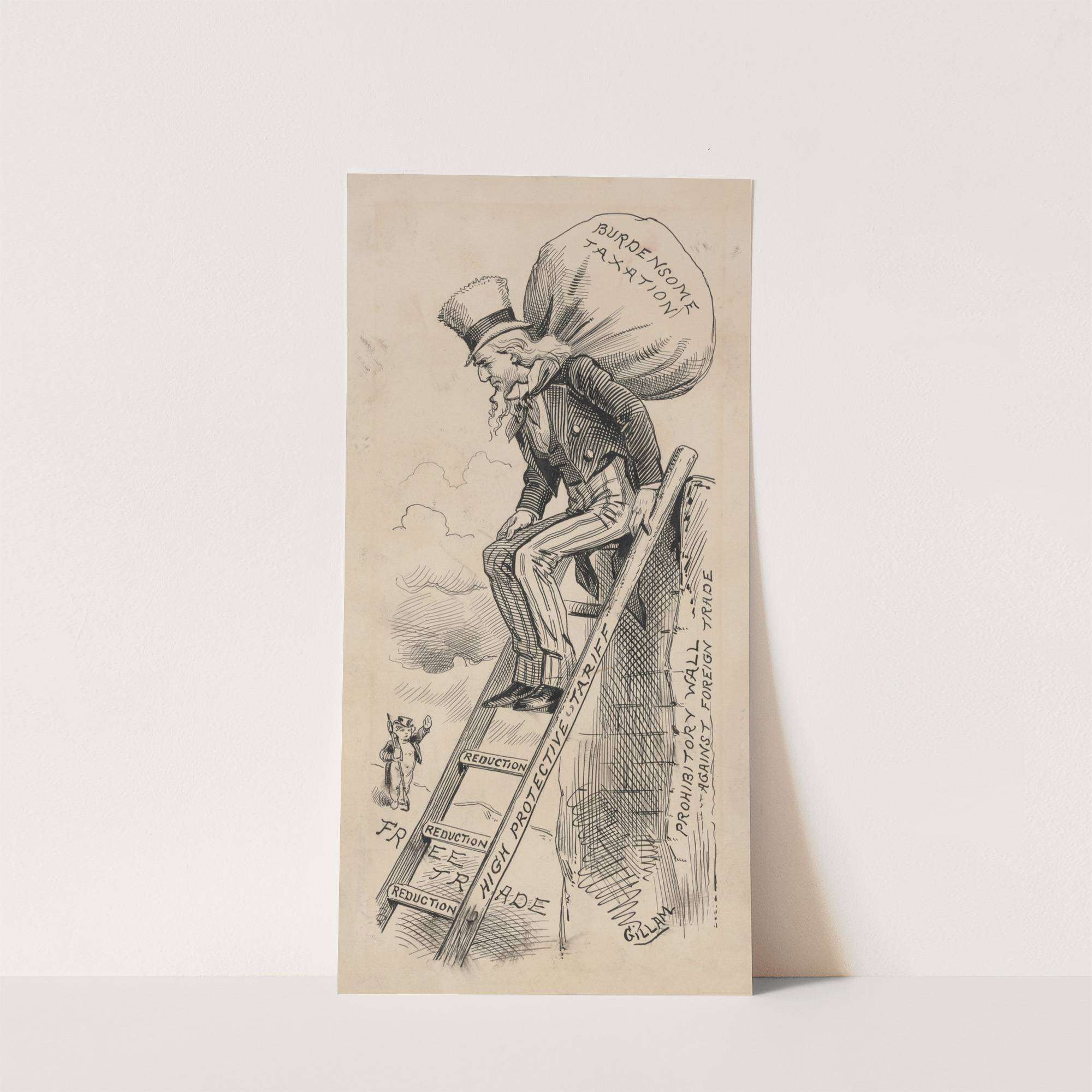 Uncle Sam atop ‘Protective Tariff’ ladder, carrying ‘Burdensome Taxation’ on his back (1883) by Bernard Gillam - Wall Art Print