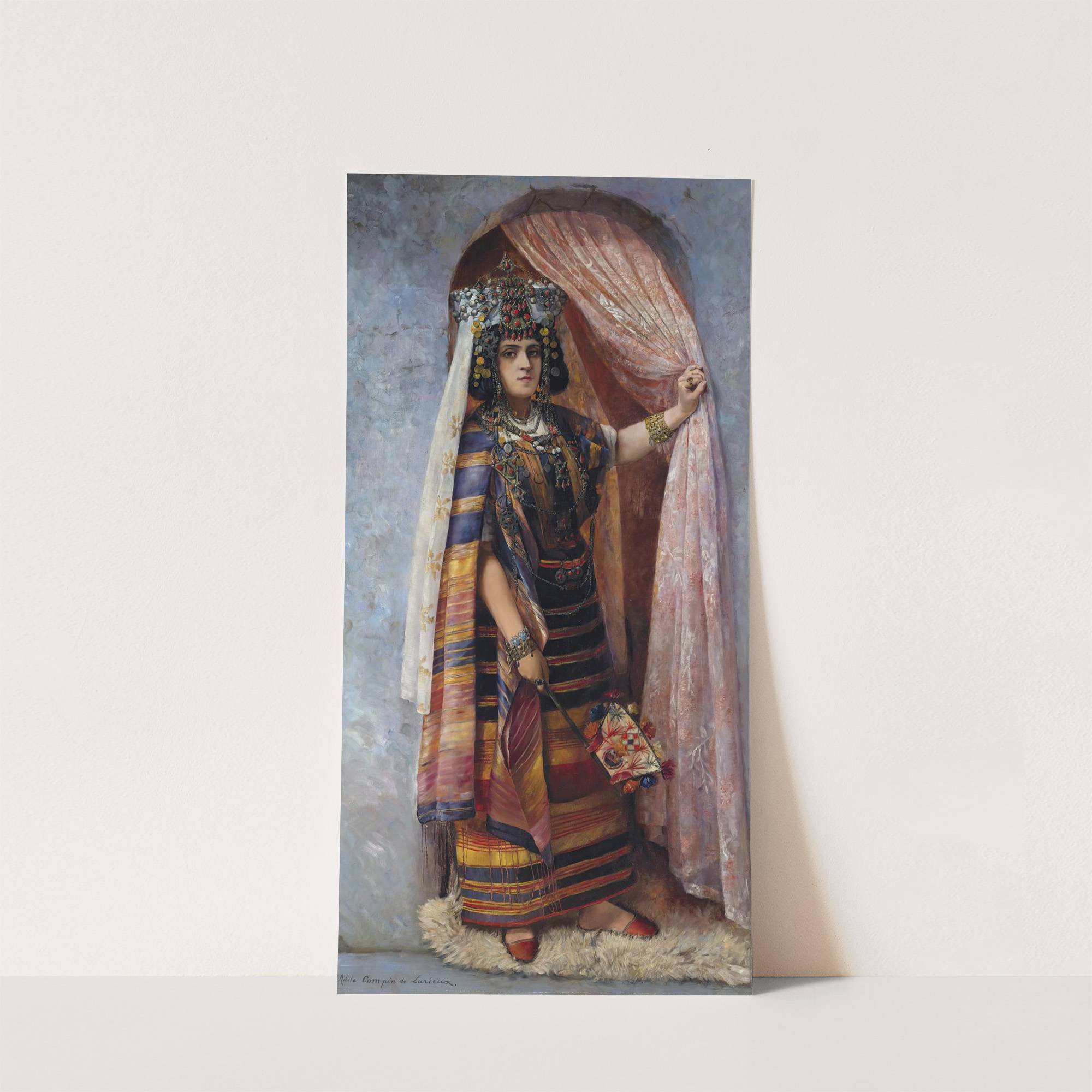 This exquisite art print titled "Une Ouled Naïl Au Pas De Sa Porte" by Adele Compin De Lurieux beautifully captures the elegance of traditional North African culture. The central figure is a poised woman standing beneath an archway adorned with...