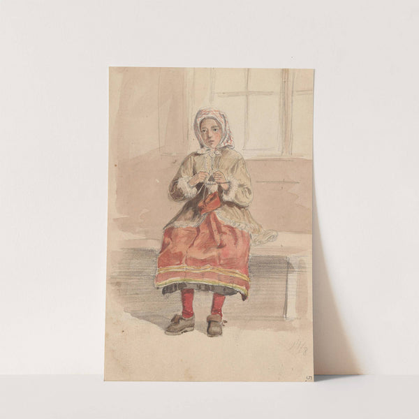 This watercolor painting by Adolph Tidemand, titled "Ung kvinde som strikker" (Young Woman Knitting), beautifully captures a moment of quiet simplicity and cultural heritage. The subject is a young girl, standing indoors against the soft, muted background of a window...