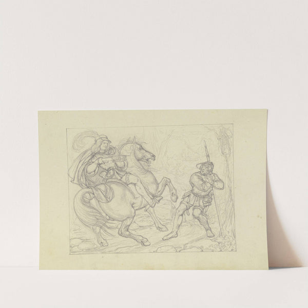 Ungedeutete Szene; Ein Ritter, einen mit einem Spieß bewaffneten Bauern an einem Bildstock mit der Armbrust bedrohend by Ferdinand Fellner - Wall Art Print