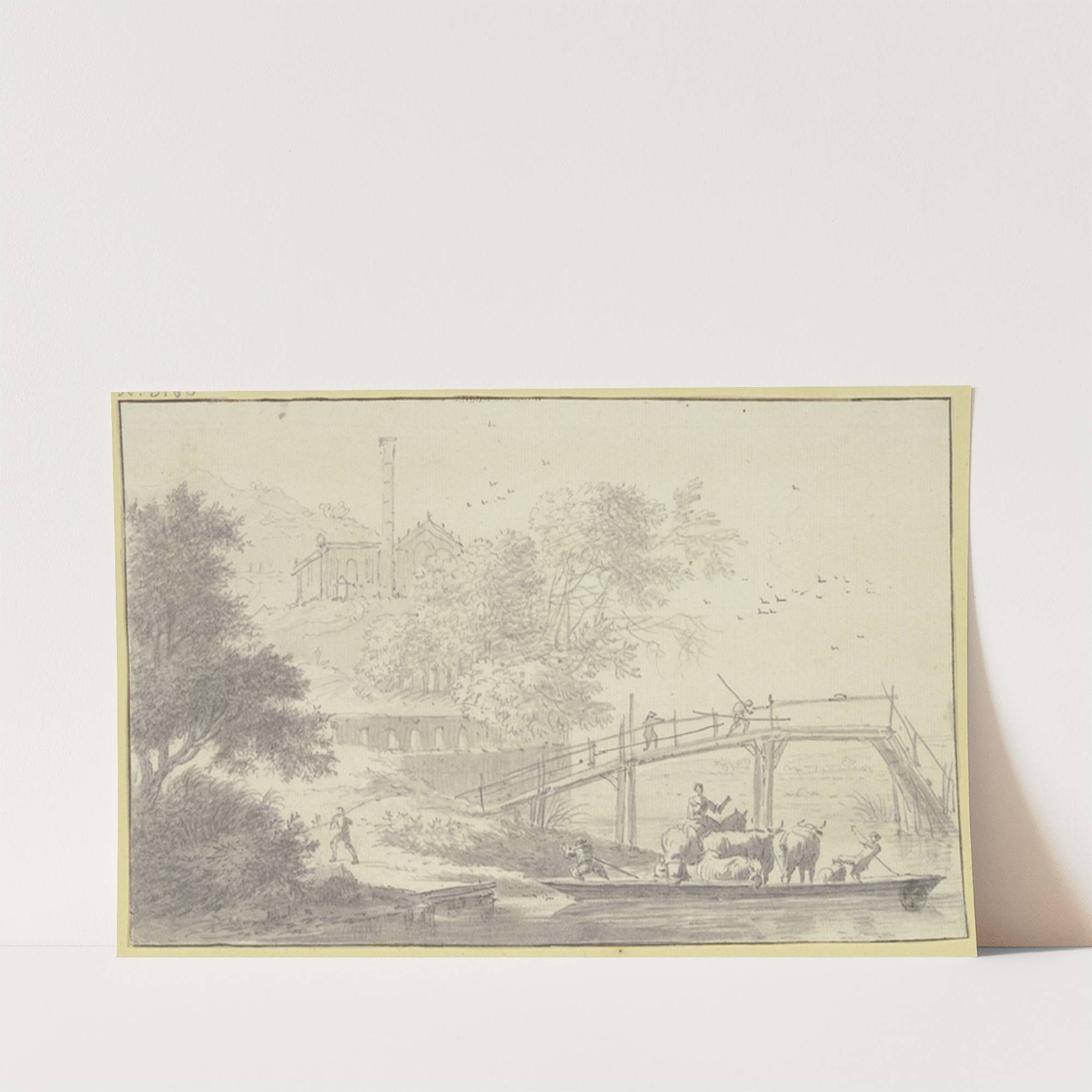 Unter einem Fluss führt ein Steg, darunter ein Kahn mit Menschen und Vieh by Evert Oudendijck - Wall Art Print