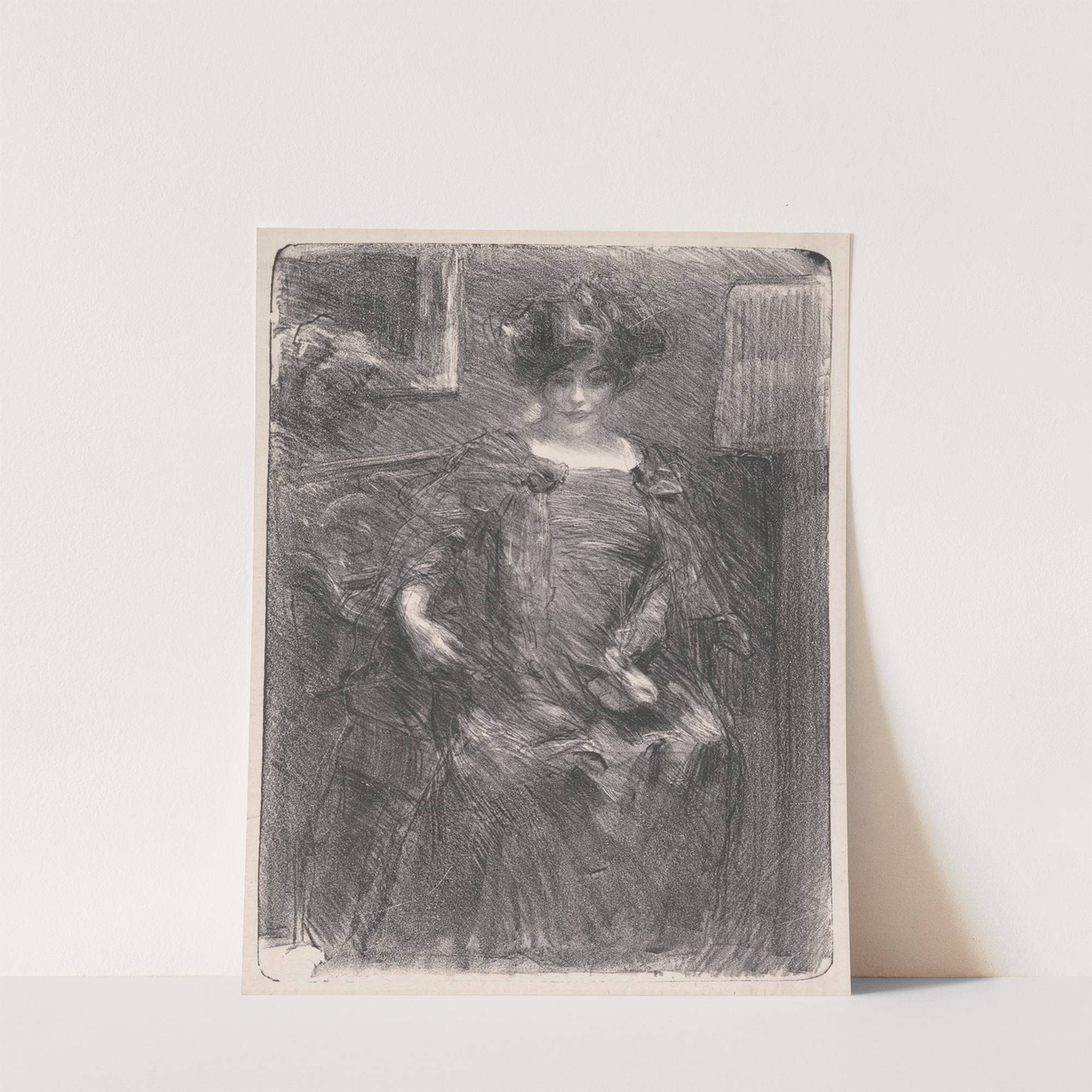 This monochromatic sketch captures the enigmatic figure of a woman in a classic, almost Victorian-style dress. The artist employs a delicate cross-hatching technique that creates a rich, textured effect, emphasizing the contours and shadows of her form. The subject's expression...