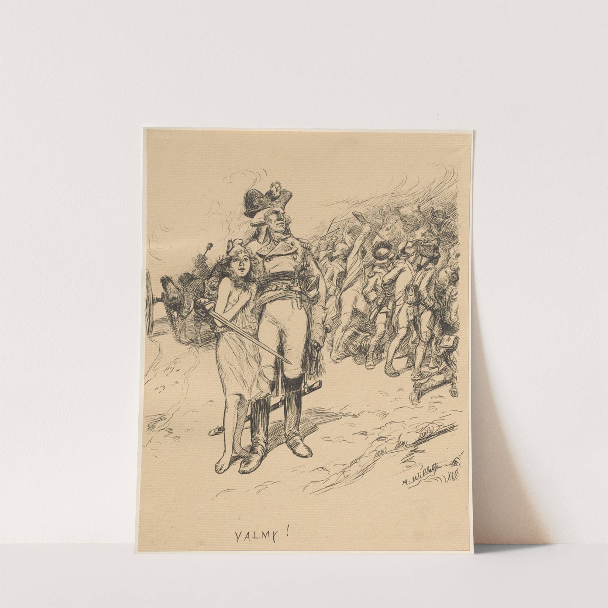 This artwork is titled "Valmy!" by Adolphe Léon Willette, created in 1898-1899. It features an intricate black and white pen drawing with fine lines and detailed cross-hatching to convey texture and depth. The central figure is a tall French soldier...