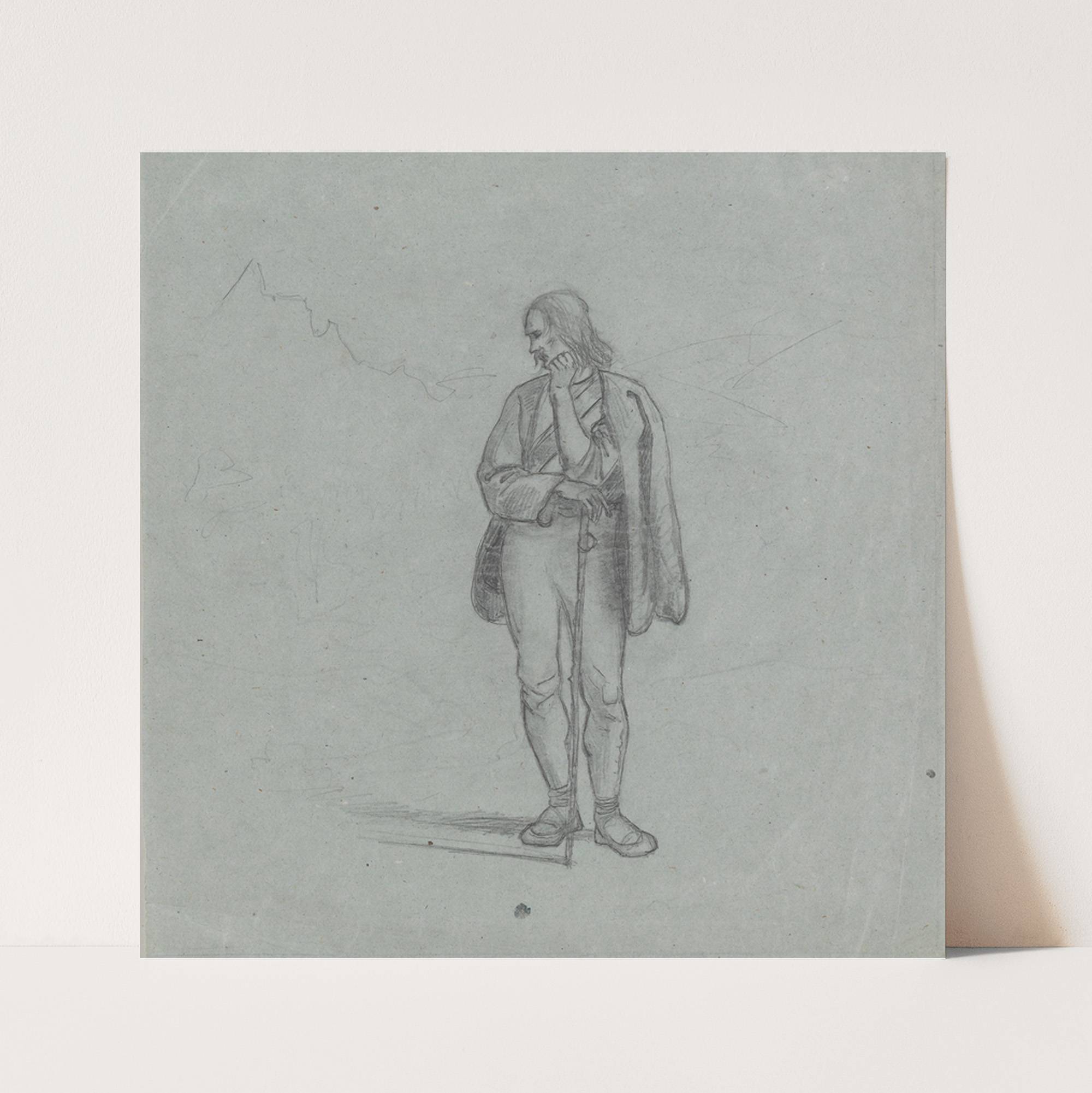 This artwork is a delicately drawn pencil sketch titled "Vandringsmann med stav" by Adolph Tidemand. It features a contemplative male figure standing with his body slightly turned to the side, lost in thought as he gazes downwards and rests his...