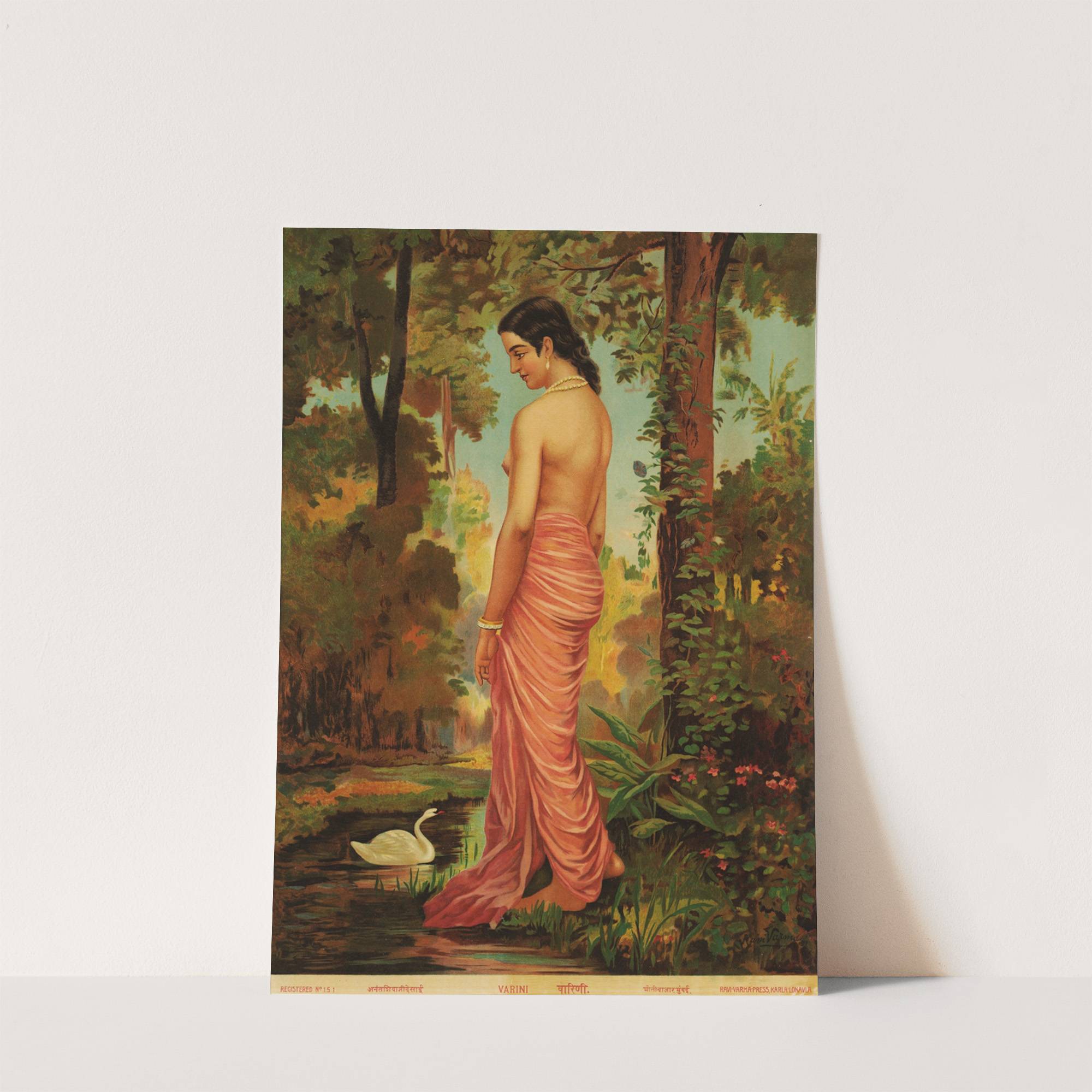 Varini, nymph by the river with a swan (1910) by Raja Ravi Varma - Wall Art Print