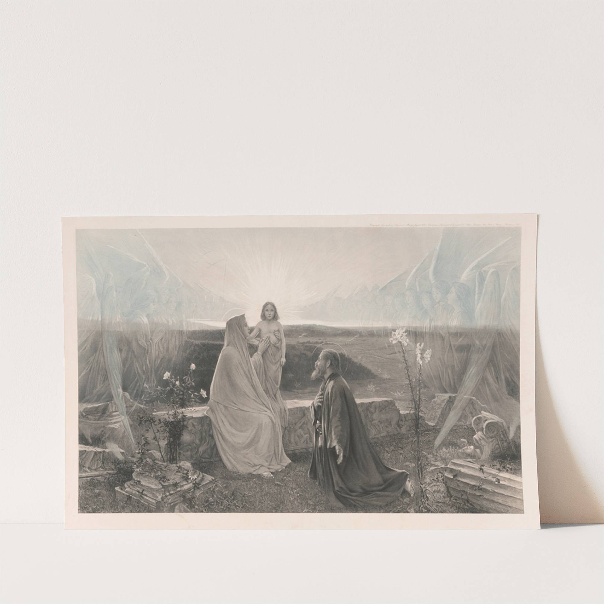This art print features "Venite adoremus" by Adolfo Tommasi, rendered in a delicate monochromatic palette of soft grays and whites. The composition showcases two figures prominently: one cloaked in flowing robes with a hood, standing beside a serene woman draped...