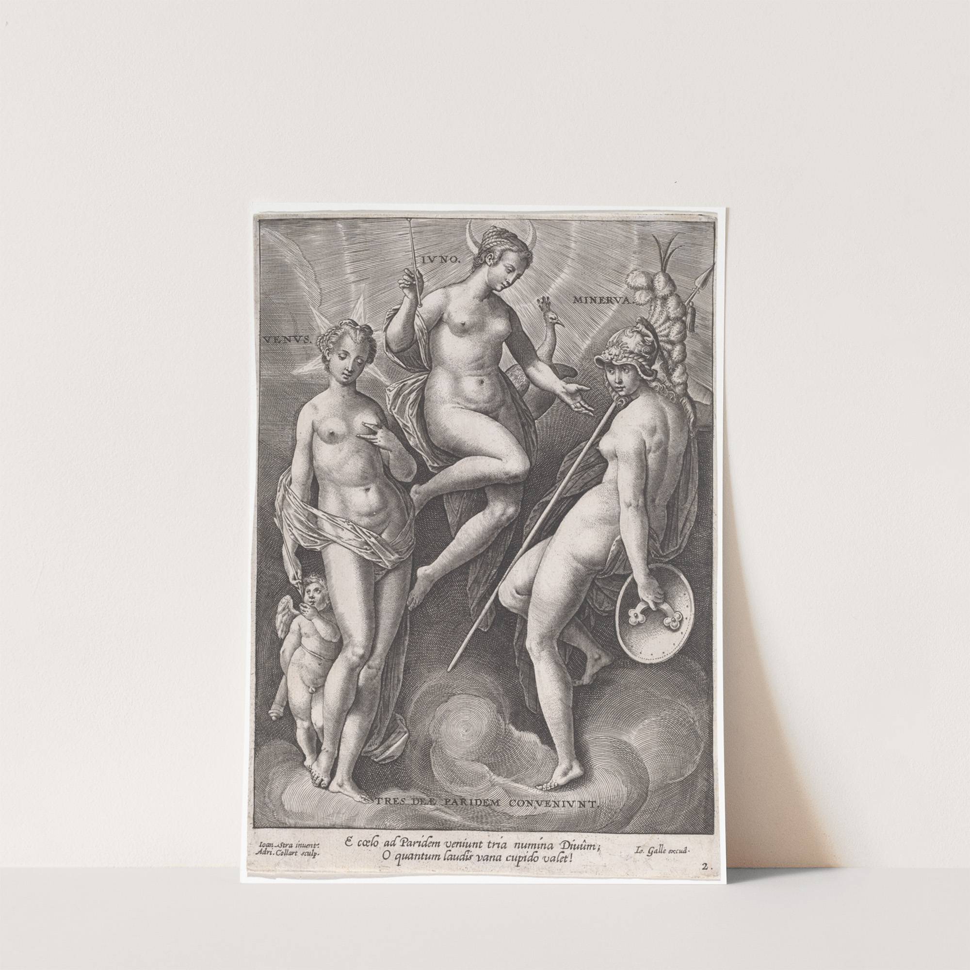 This black-and-white art print features "Venus, Juno, and Minerva" by the artist Adriaen Collaert. The classic engraving depicts three female figures in an ethereal, cloud-filled setting. Venus stands at the center, nude with a confident posture, her right arm raised...