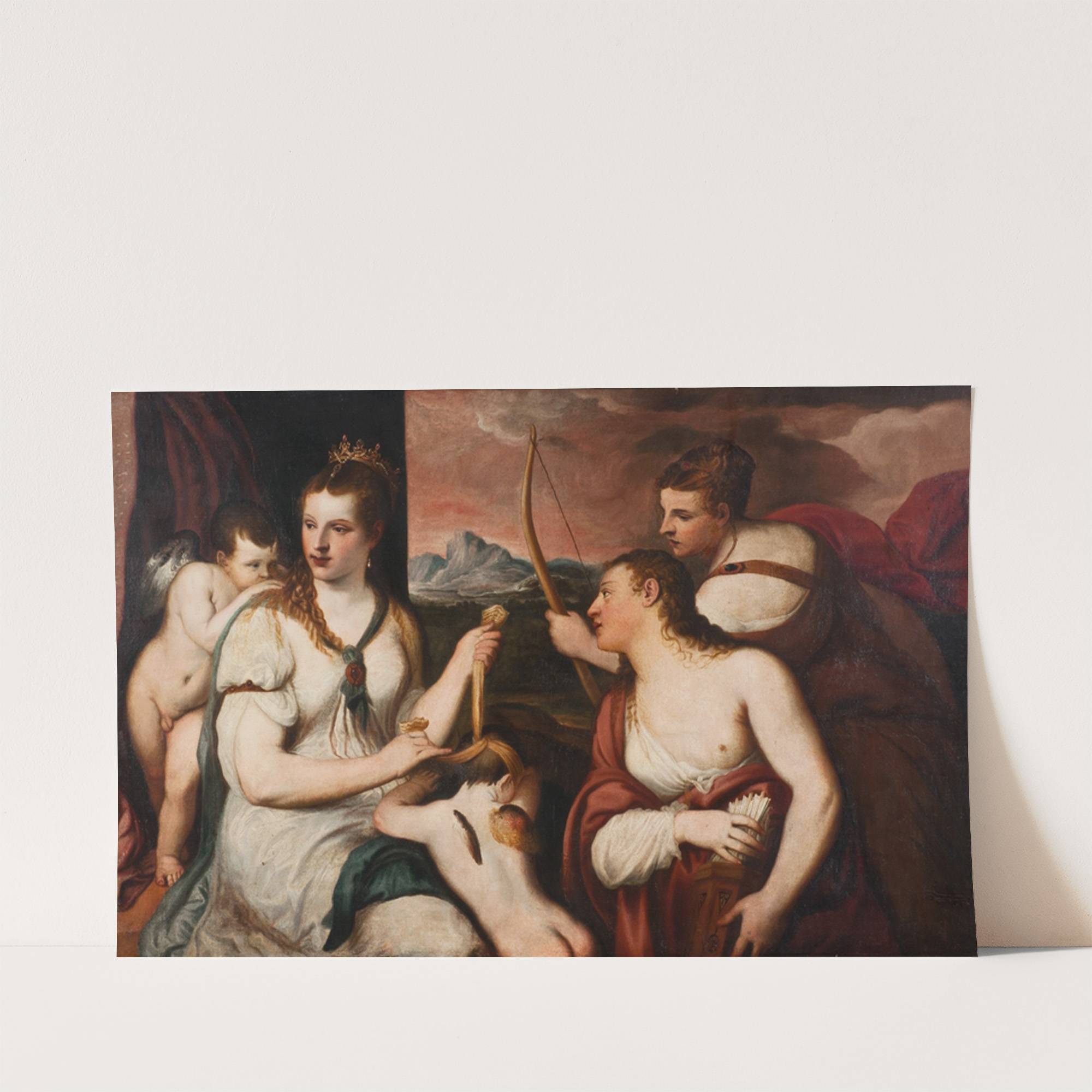 This stunning art print showcases "Venus sätter bindel för Amors ögon" by Andrea Schiavone, an exquisite example of Baroque painting. The composition is rich with vibrant colors and intricate details, bringing the classical myth to life. At the center, Venus,...