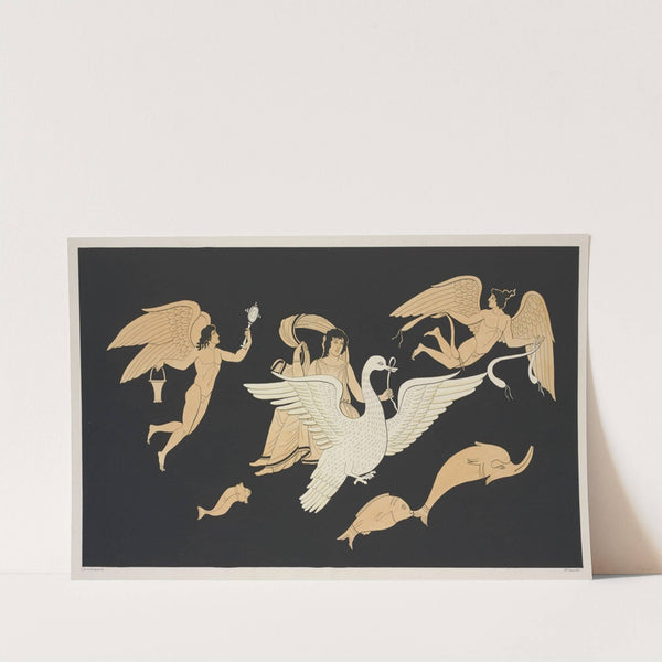 This art print features "Venus Seated on a Swan and Accompanied by Two Hermaphrodites" by Alexis Louis Pierre Housselin, created between 1844-1861. The artwork is rendered in a striking contrast of pale beige figures against a deep black background, emphasizing...