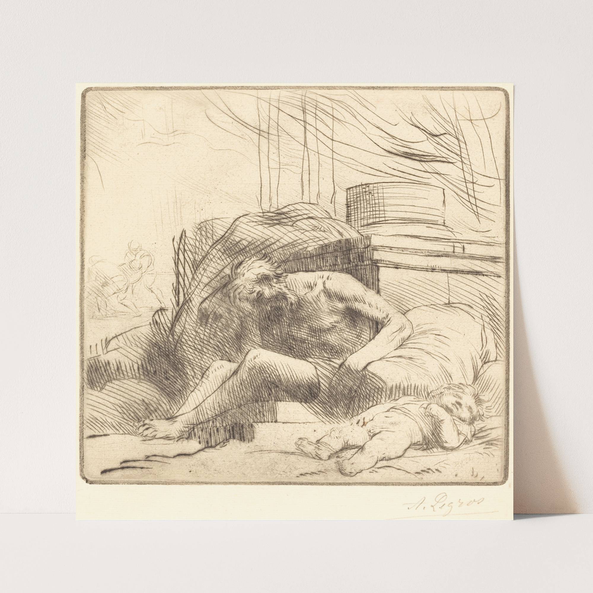 This art print features "Victim of a Fire" by Alphonse Legros, an exceptional piece rendered in monochromatic ink. The composition captures a poignant moment of distress and vulnerability. A partially clothed woman with long, flowing hair is hunched over in...