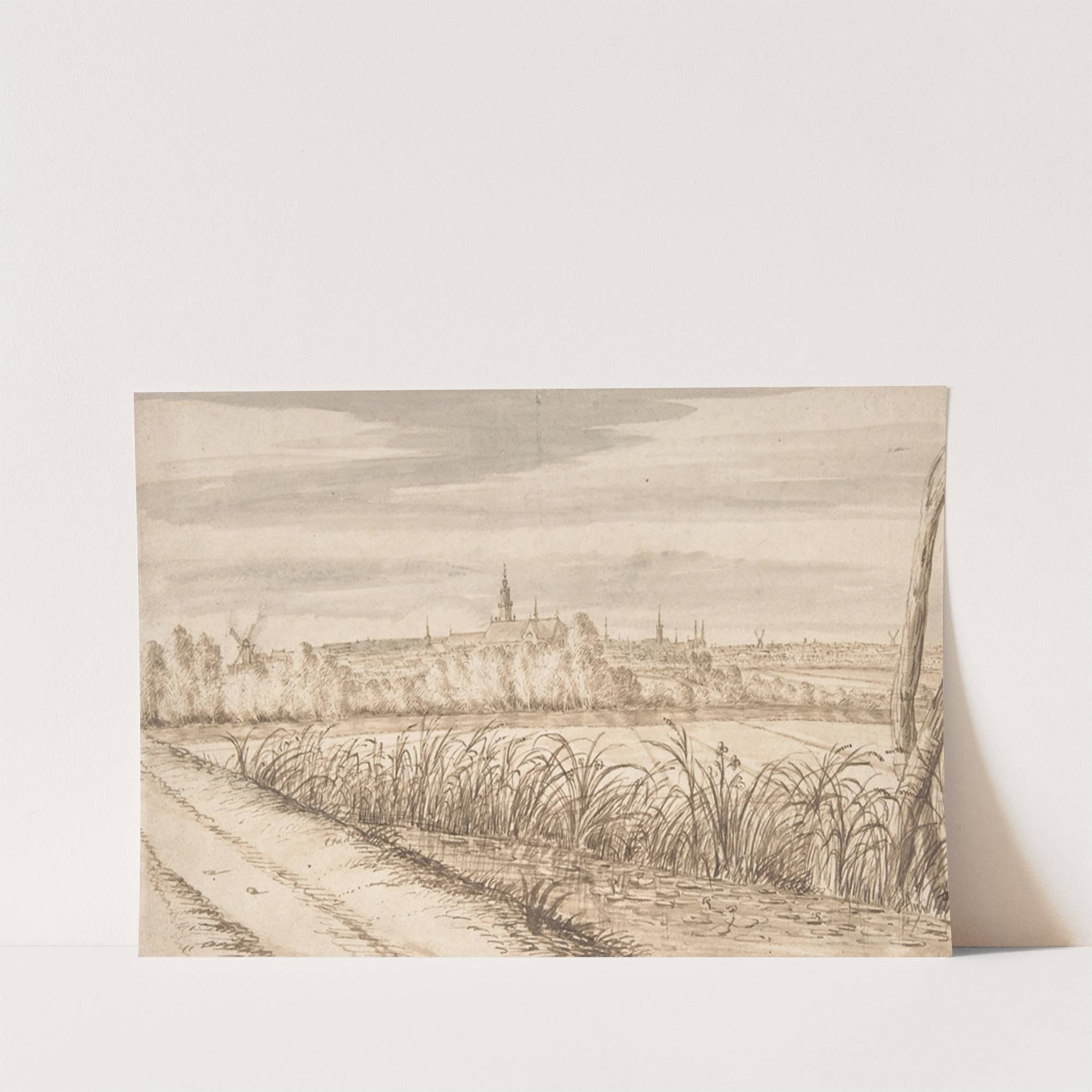 This art print features a serene landscape drawing titled "View of Gouda Seen from the Southeast with the Janskerk in the Center" by Abraham Rutgers, created circa 1916. The illustration is rendered in a delicate sepia tone, evoking a nostalgic...