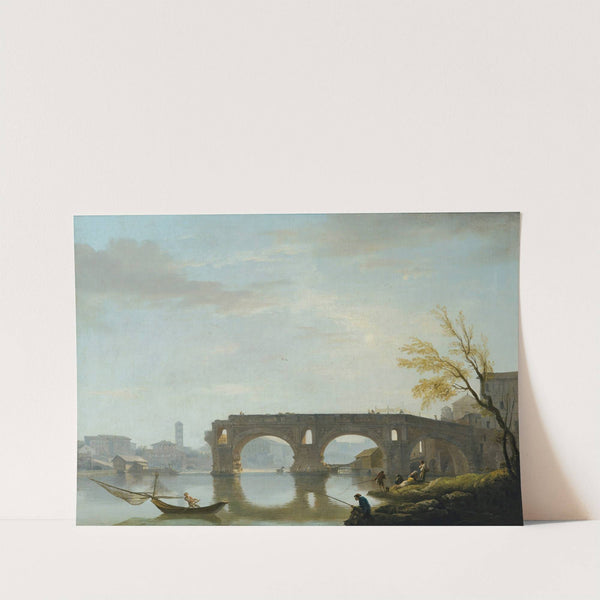 This artwork, "View of the Ponte Rotto, Rome" by Claude-Joseph Vernet, captures a serene riverside scene in Rome with remarkable detail and realism. The painting showcases a historic Roman bridge with three large arches, spanning across a calm river that...