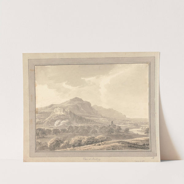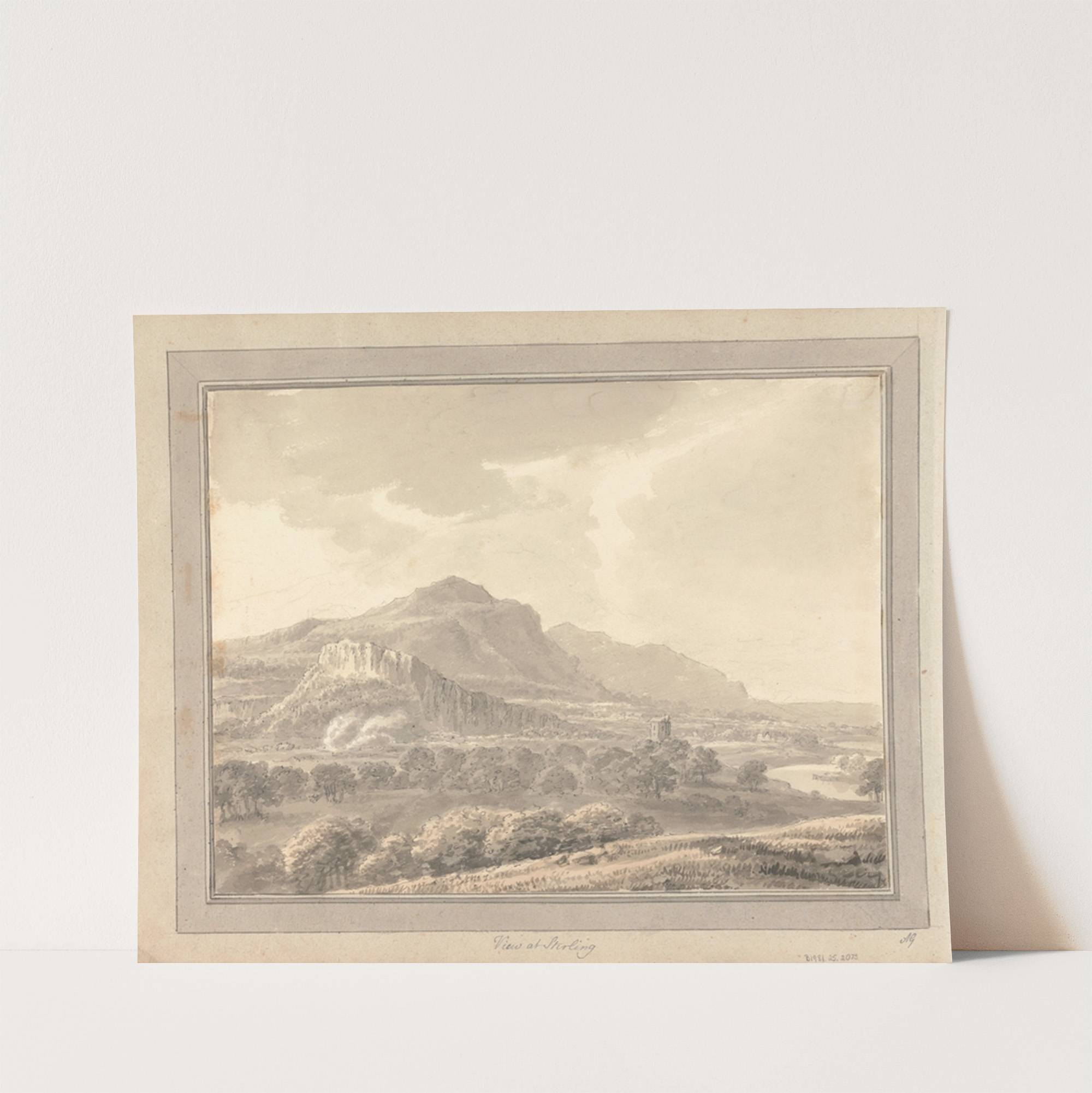 This stunning art print captures the serene beauty of a Scottish landscape titled "Tour in Scotland: View at Sterling." Rendered in delicate sepia tones, this illustration showcases rolling hills, textured foliage, and a distant rocky mountain range bathed in gentle...