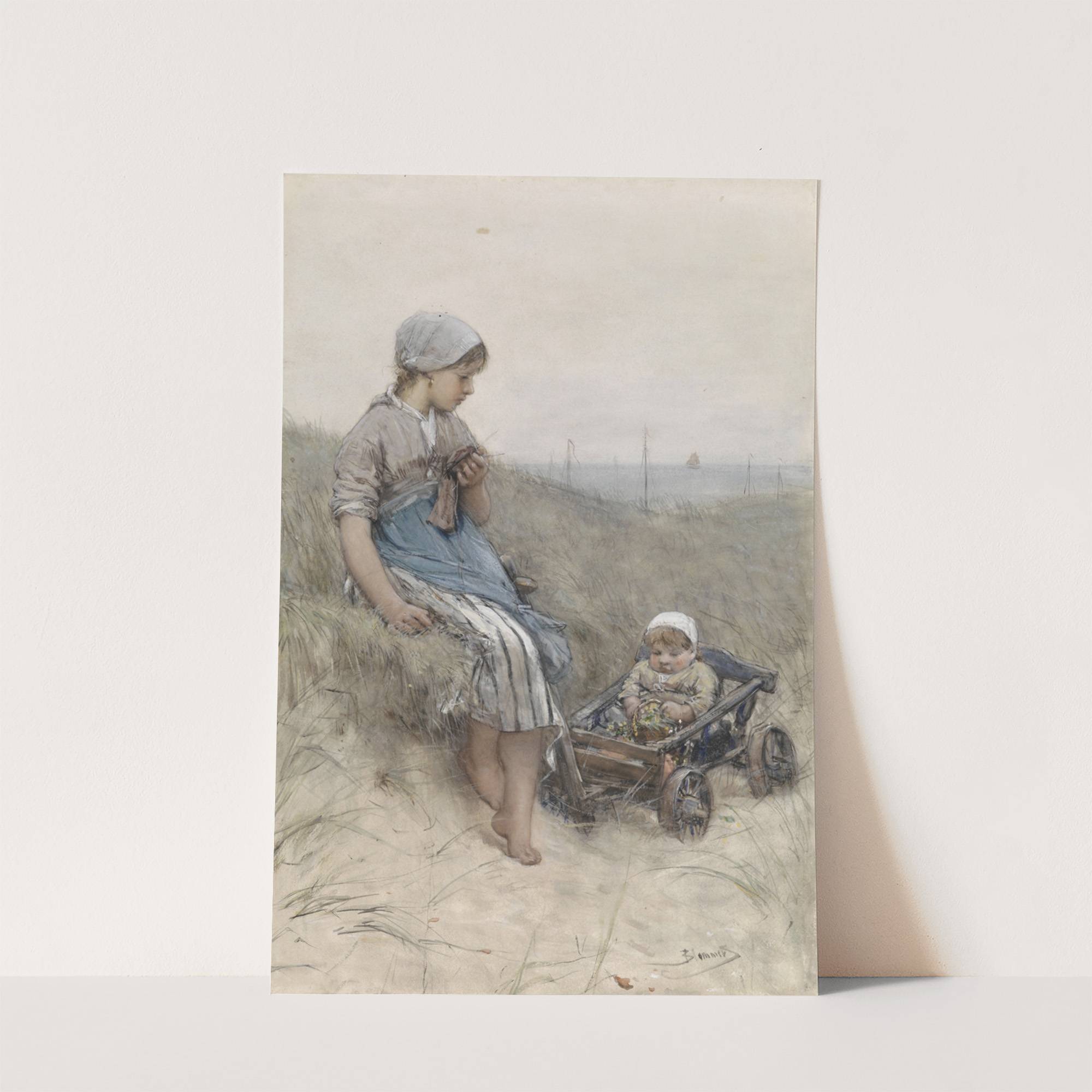 Vissersmeisje met kind in kinderwagen in de duinen by Bernardus Johannes Blommers - Wall Art Print