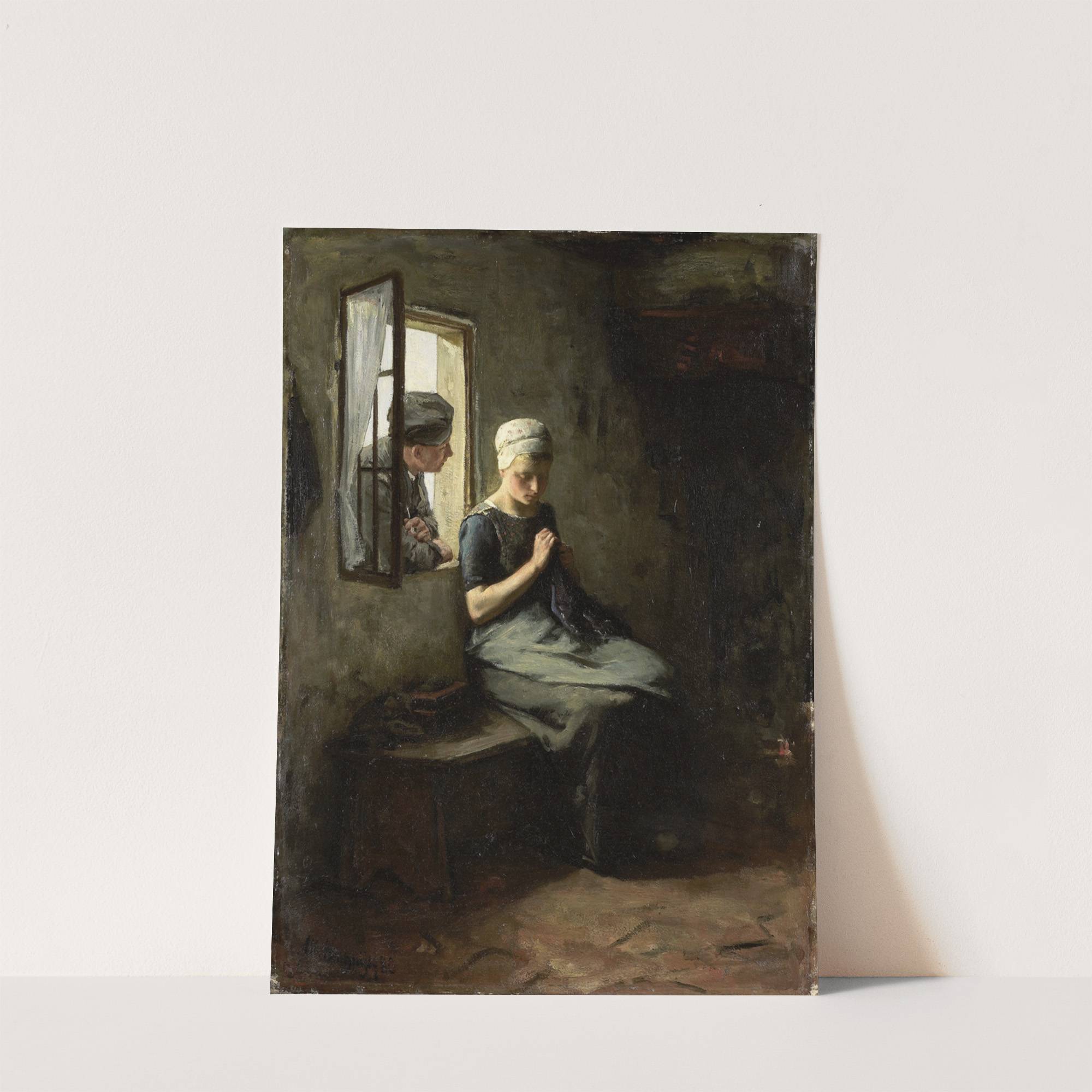This art print features "Vissersvrijage" by Albert Neuhuys, capturing a poignant moment of rural life with rich, dark hues and textured brushwork. The central figure is a woman sitting on a rustic wooden bench, absorbed in prayer, her hands pressed...