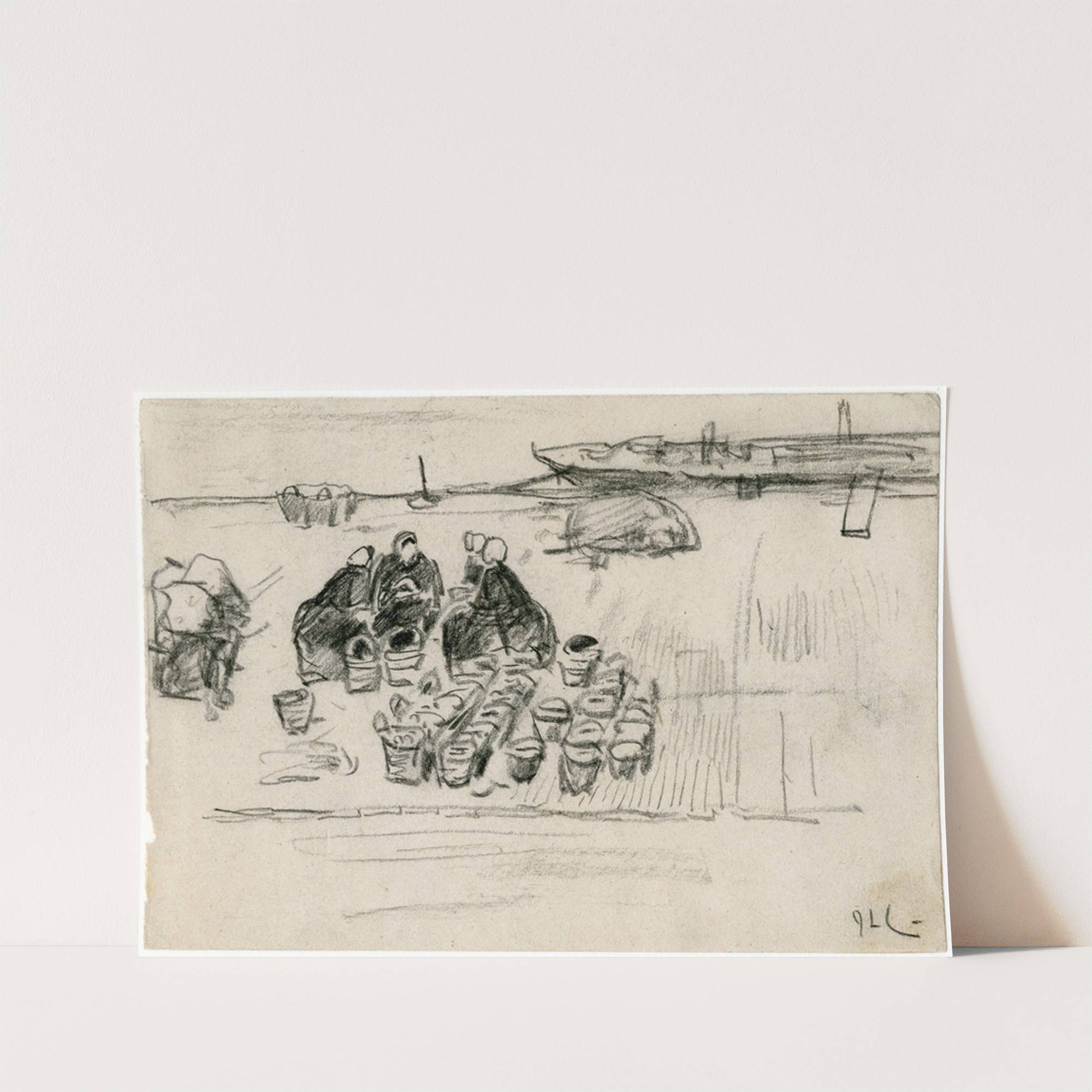 This black-and-white sketch features "Vissersvrouwen op de kade" (Fishwives on the Quay) by Adolf Le Comte. The drawing uses fine, deliberate pencil strokes to capture a lively scene at what appears to be a dockside market. In the foreground, multiple...
