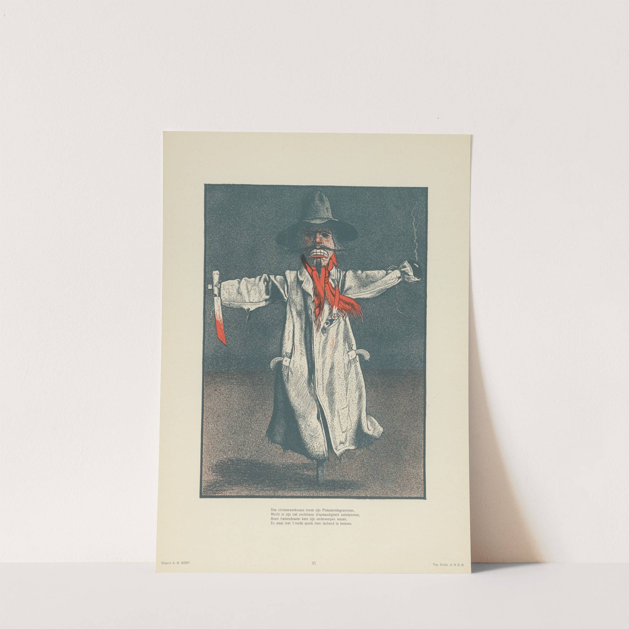 This striking print features "Vogelverschrikker" by Albert Hahn, showcasing a unique blend of whimsy and macabre. The central figure is a scarecrow-like character standing with arms outstretched in an inviting yet eerie manner. Dressed in a long white coat that...