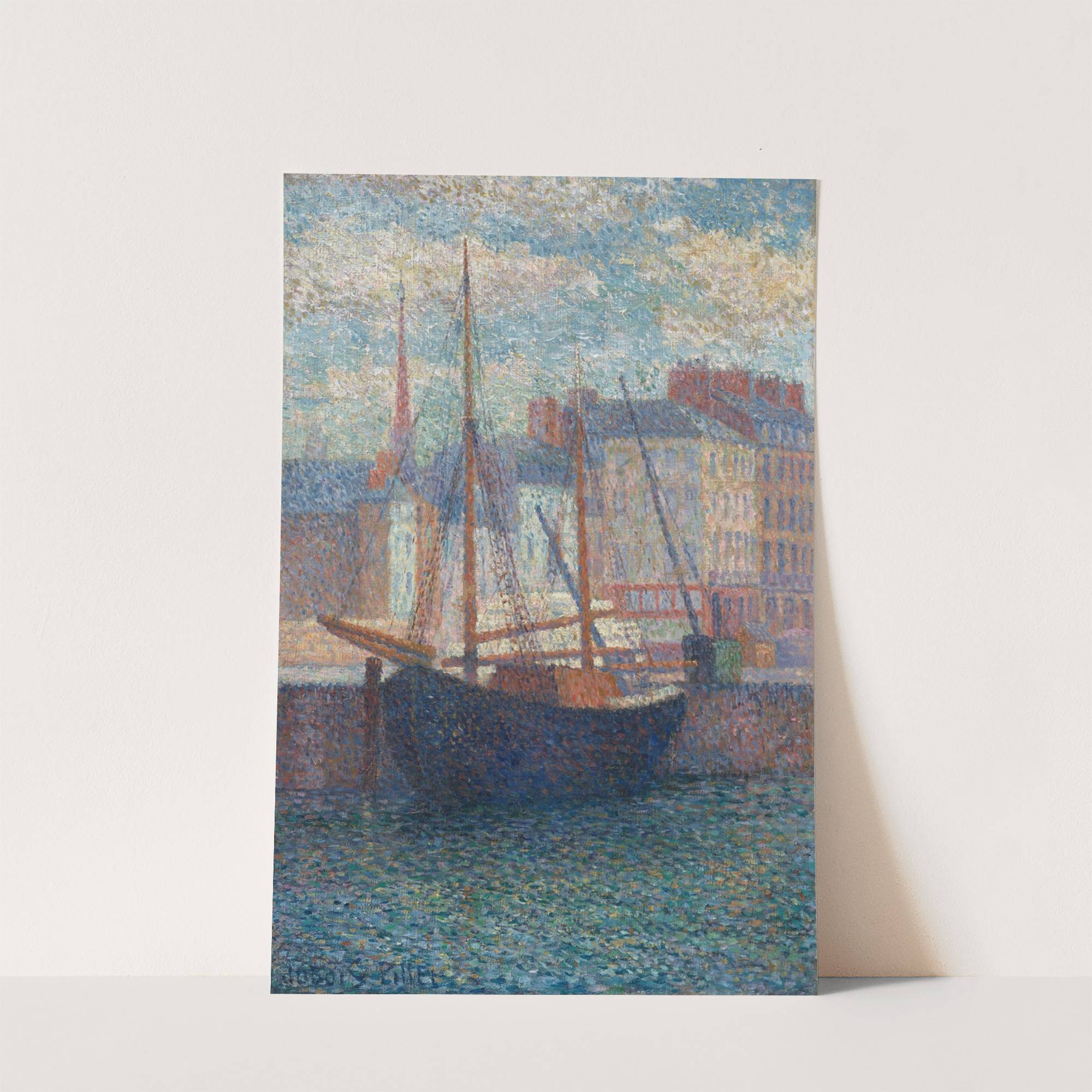 This beautiful art print features "Voilier ? quai" by Albert Dubois-Pillet, showcasing an impressionist style painting with a mesmerizing dot-point technique. The image depicts a tranquil harbor scene, where a dark wooden sailboat with tall masts is moored against a...