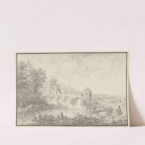 Von Türmen flankierte Brücke, im Vordergrund am Fluß ein Angler und ein Reiter by Franz Schütz - Wall Art Print