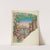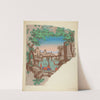 This vibrant art print depicts "Wall Paper" by artist Albert Levone. The scene is set in an idyllic, medieval riverside town featuring a tranquil river with clear blue water flowing gently beneath a stone arch bridge that connects to the...