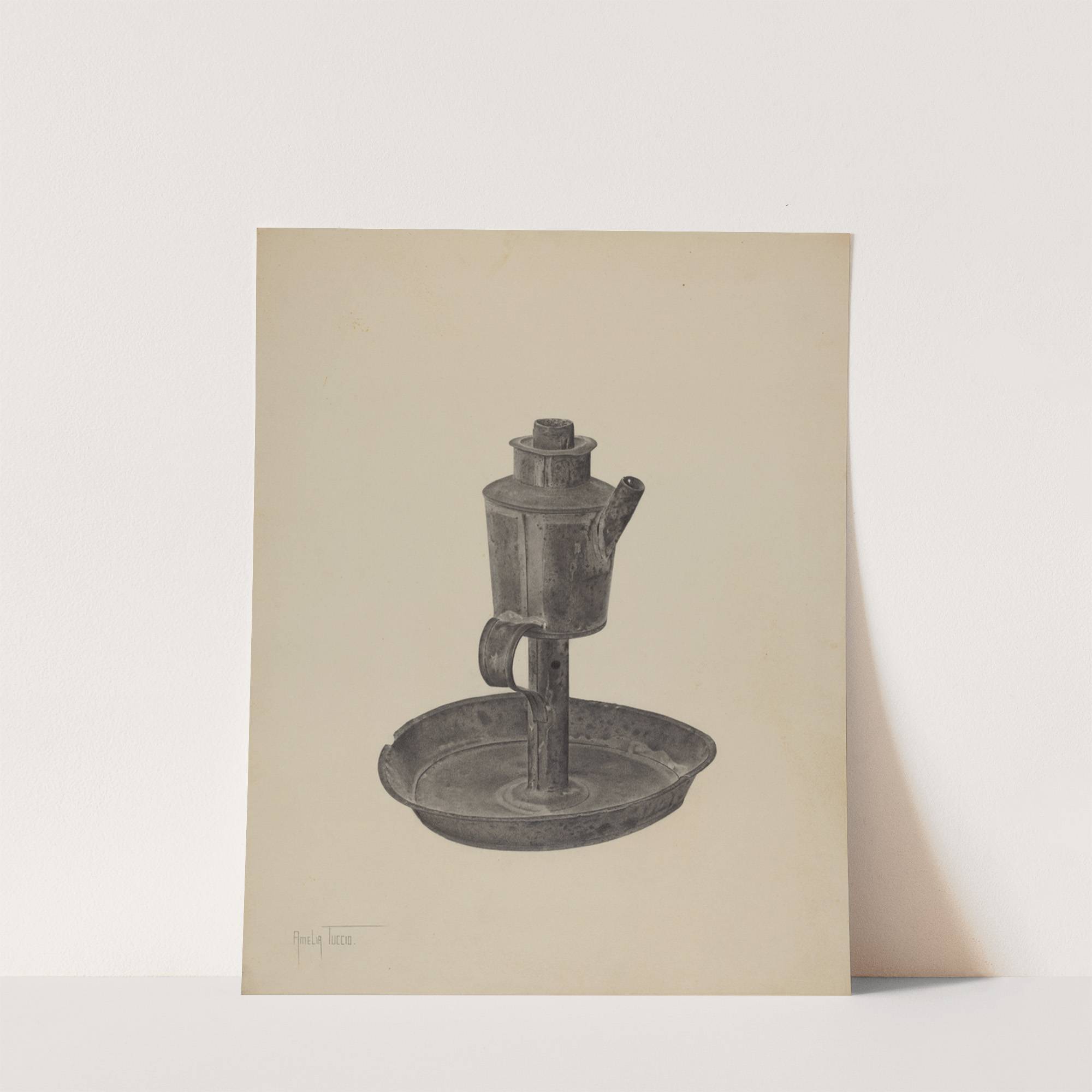 This striking art print titled "Whale Oil Lamp" by Amelia Tuccio captures the rustic beauty of an old industrial object in exquisite detail. Rendered in monochromatic shades of grey and black, the lamp features a cylindrical oil reservoir topped with...