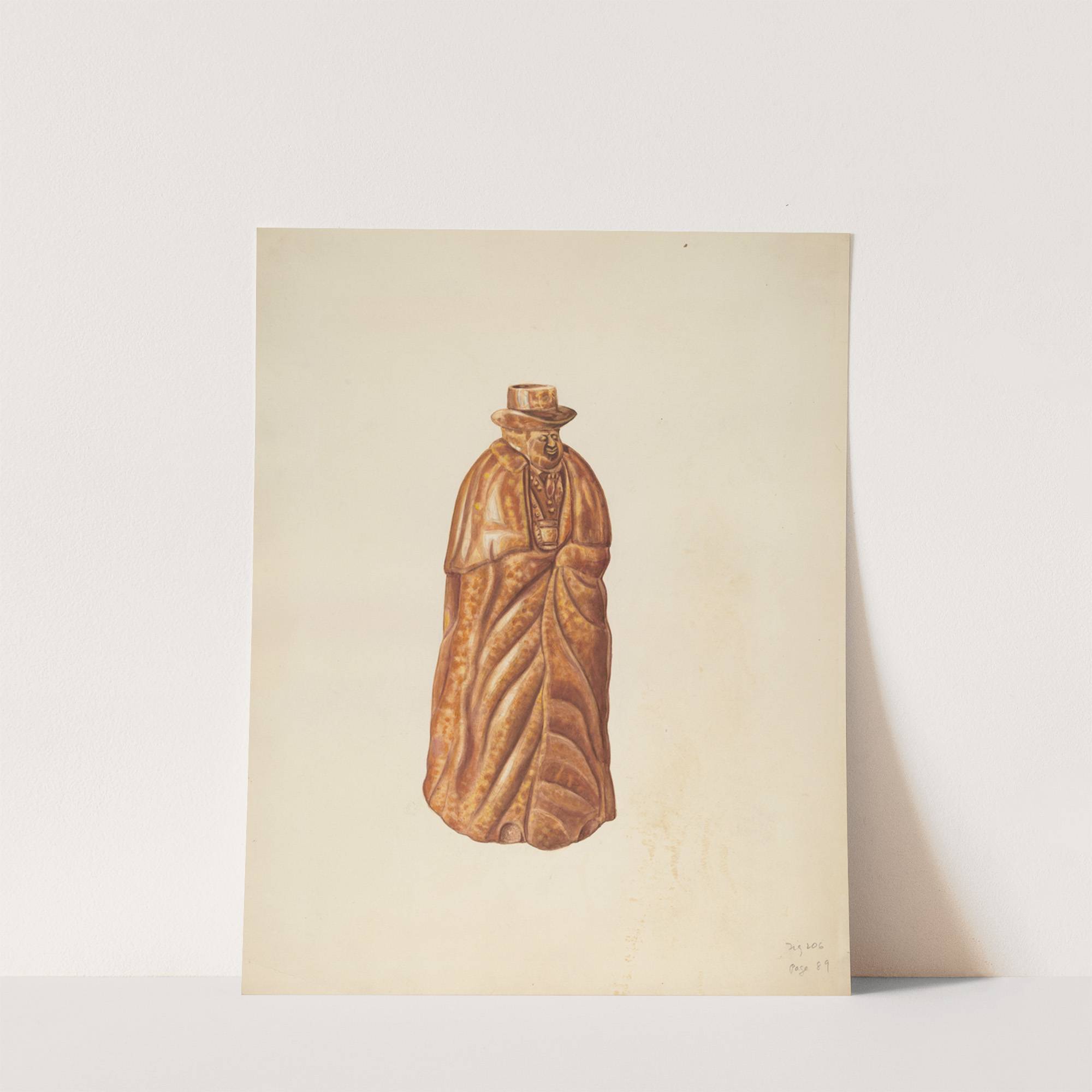 This art print features "Wine Bottle" by artist Al Curry, showcasing a unique and detailed sculpture-like representation of a human figure adorned in traditional attire. The piece is crafted with an eye-catching bronze finish that highlights the intricate textures and...