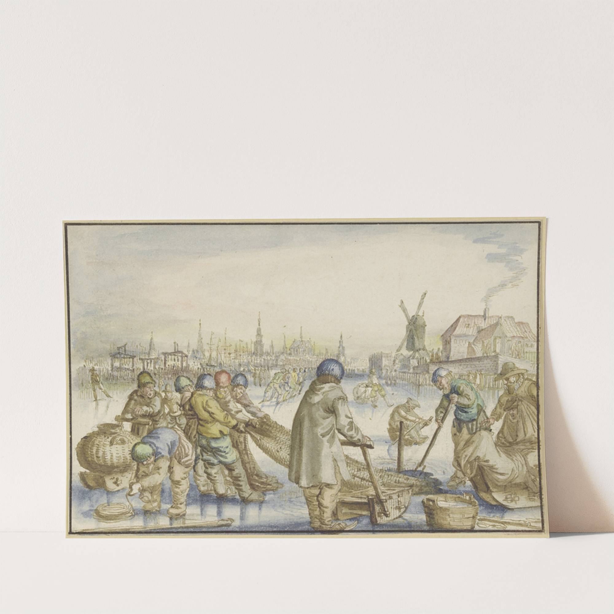 Winterlandschaft mit vielen Schlittschuhläufern, im Vordergrund ziehen Fischer ein Netz aus dem Eise by Claes Janszoon Visscher I - Wall Art Print