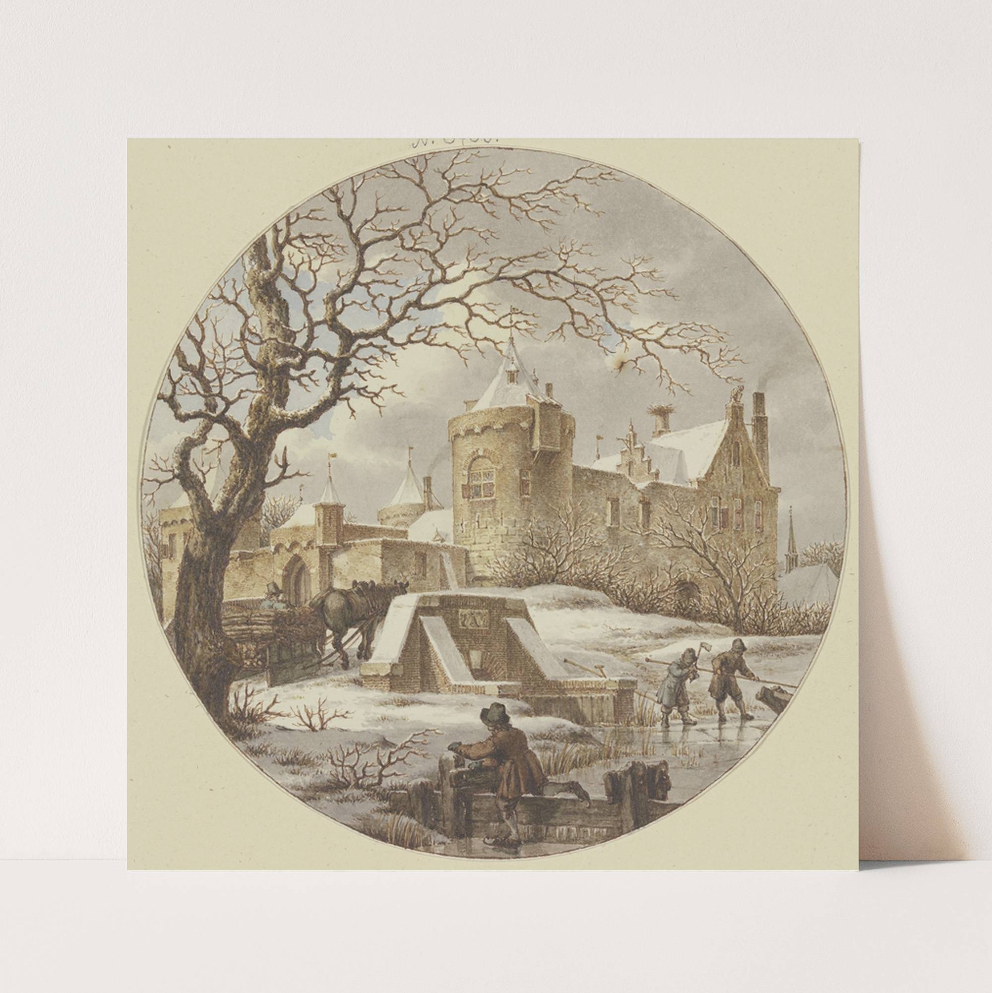 Winterlandschaft vor der Stadtmauer, auf der Brücke ein Holzschlitten by Jacob Cats - Wall Art Print