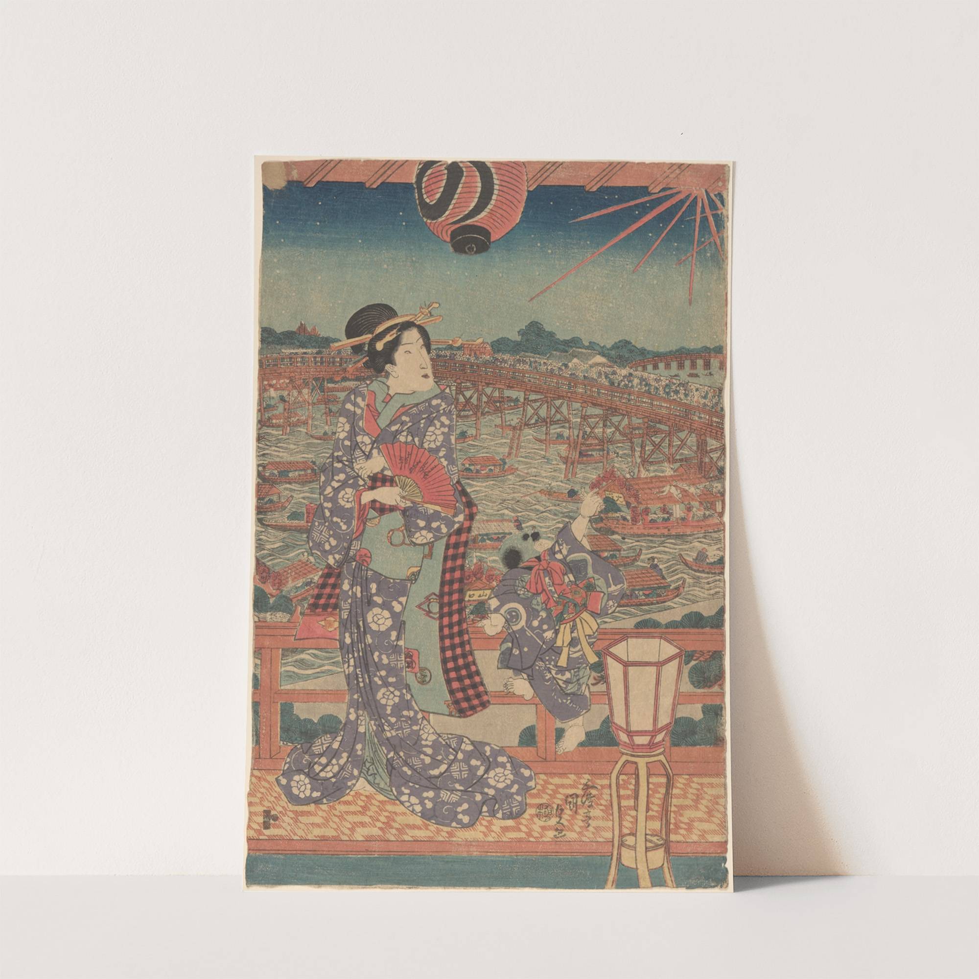 Woman and Child in Purple Kimono Overlooking Boats and Bridge (19th century) by Utagawa Kunisada (Toyokuni III) - Wall Art Print