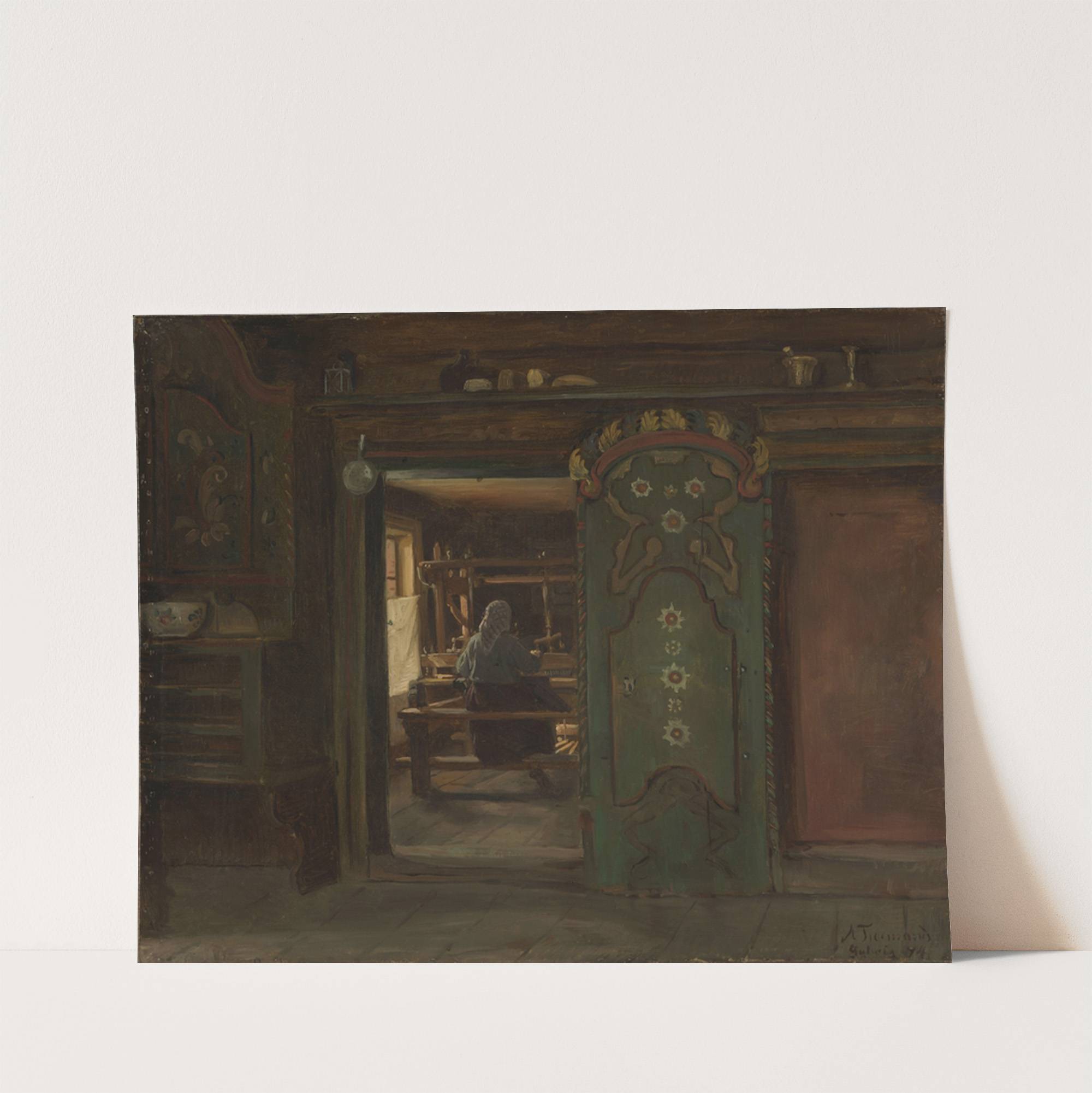 This painting depicts "Woman at the Loom" by Adolph Tidemand, a masterpiece capturing serene domestic life in rich detail. The focal point is a woman sitting alone at a wooden loom inside a warmly lit room, her back to the...
