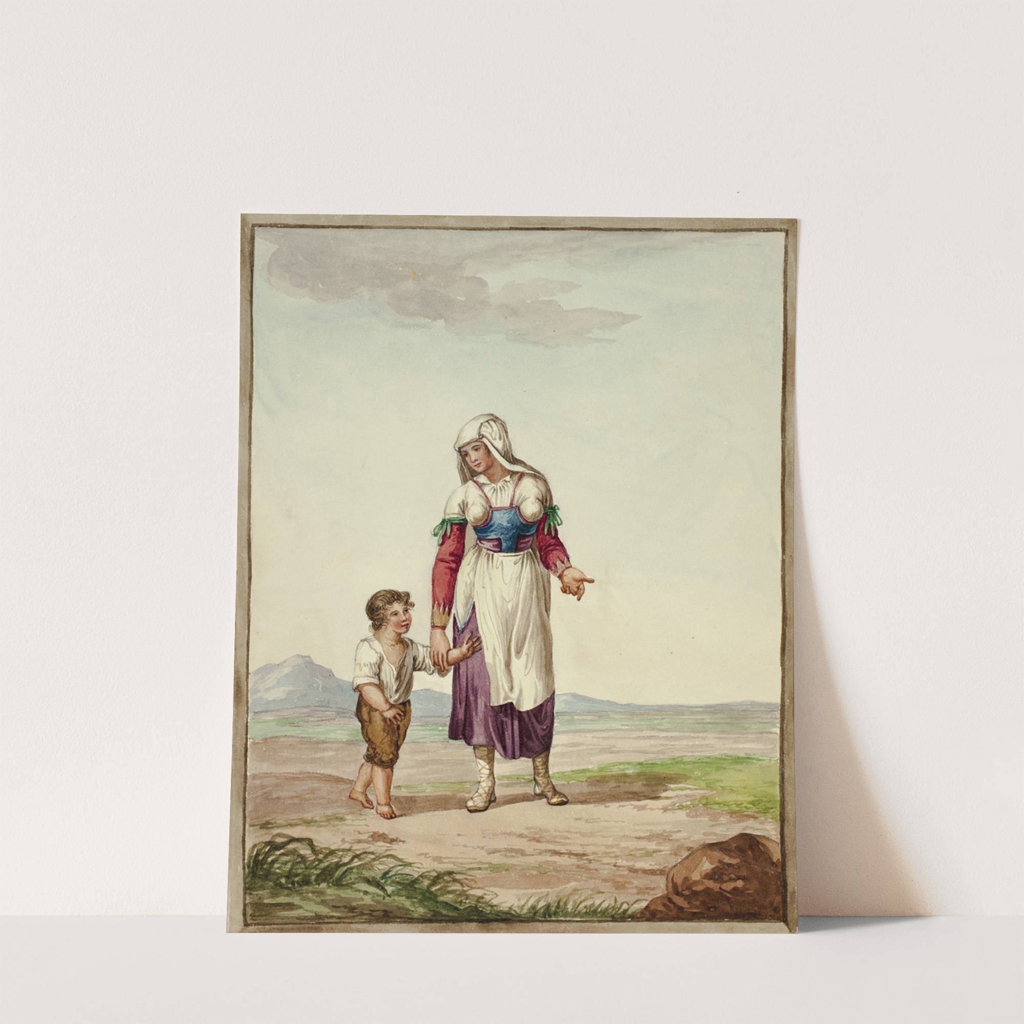 This beautifully detailed artwork features "Woman in Native Costume with Boy on Road" by artist Bartolomeo Pinelli. The scene depicts a tender moment between an adult woman and a young boy, set against a serene rural landscape. The woman is...