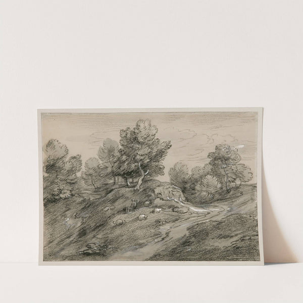 Wooded upland landscape with shepherd and sheep and country track winding around a knoll by Thomas Gainsborough - Wall Art Print