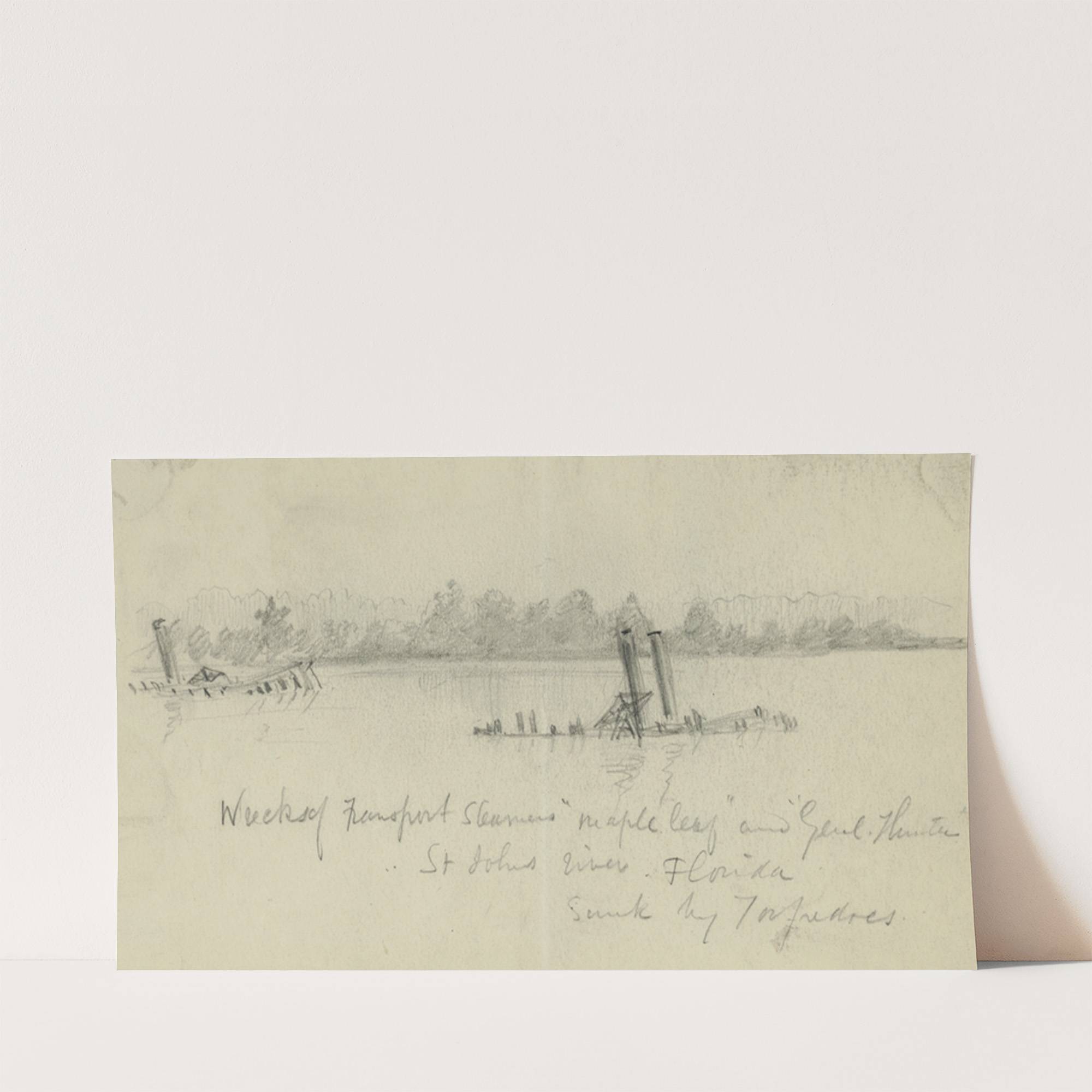 This art print features a delicate pencil sketch titled "Wreck of Transport Steamers 'Maple Leaf' and 'Genl. Hunter', St. Johns River. Florida, Sunk by Torpedoes" by artist Alfred Rudolph Waud. The scene depicts an overgrown, sunken shipwreck partially submerged in...