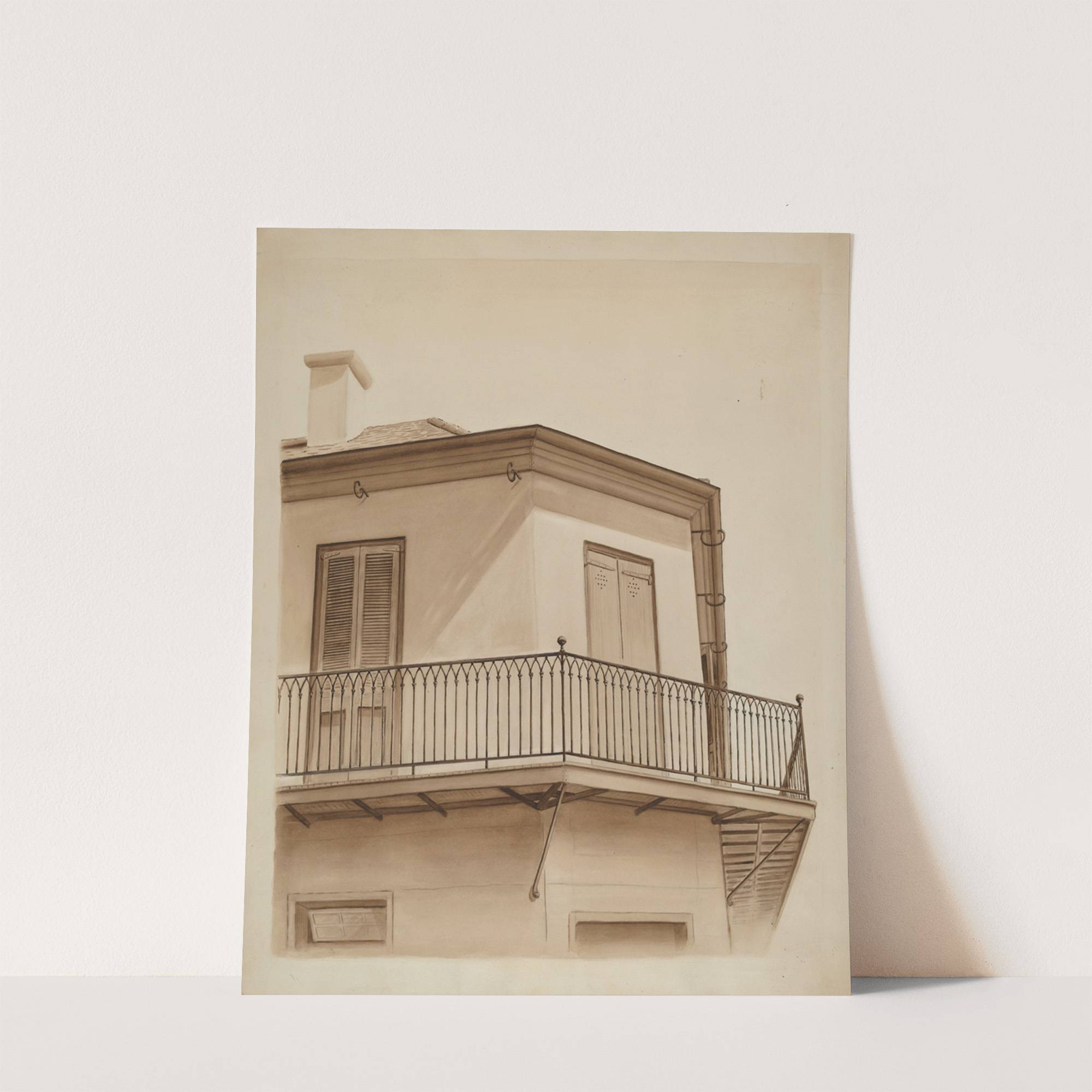 This sepia-toned photograph captures the classic charm of a European-style building facade with an emphasis on its wrought iron balcony railing. The exterior wall is painted in a soft cream color, contrasting subtly with the darker wrought iron of the...