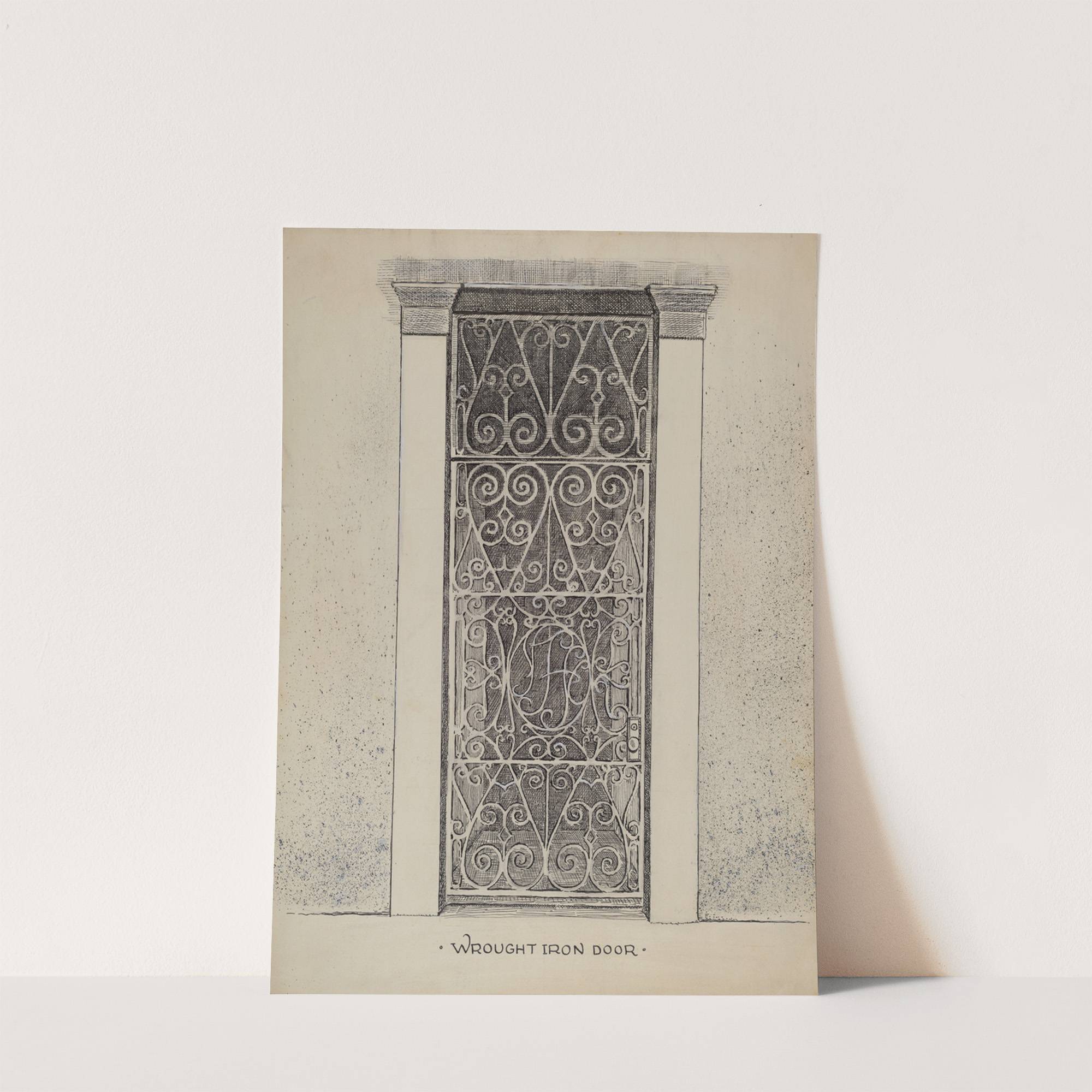 This artwork is "Wrought Iron Door" by Al Curry, showcasing a detailed black-and-white illustration of an ornate wrought iron door. The intricately designed gate features swirling patterns and elegant scrolls that create a sense of motion and complexity. The vertical...