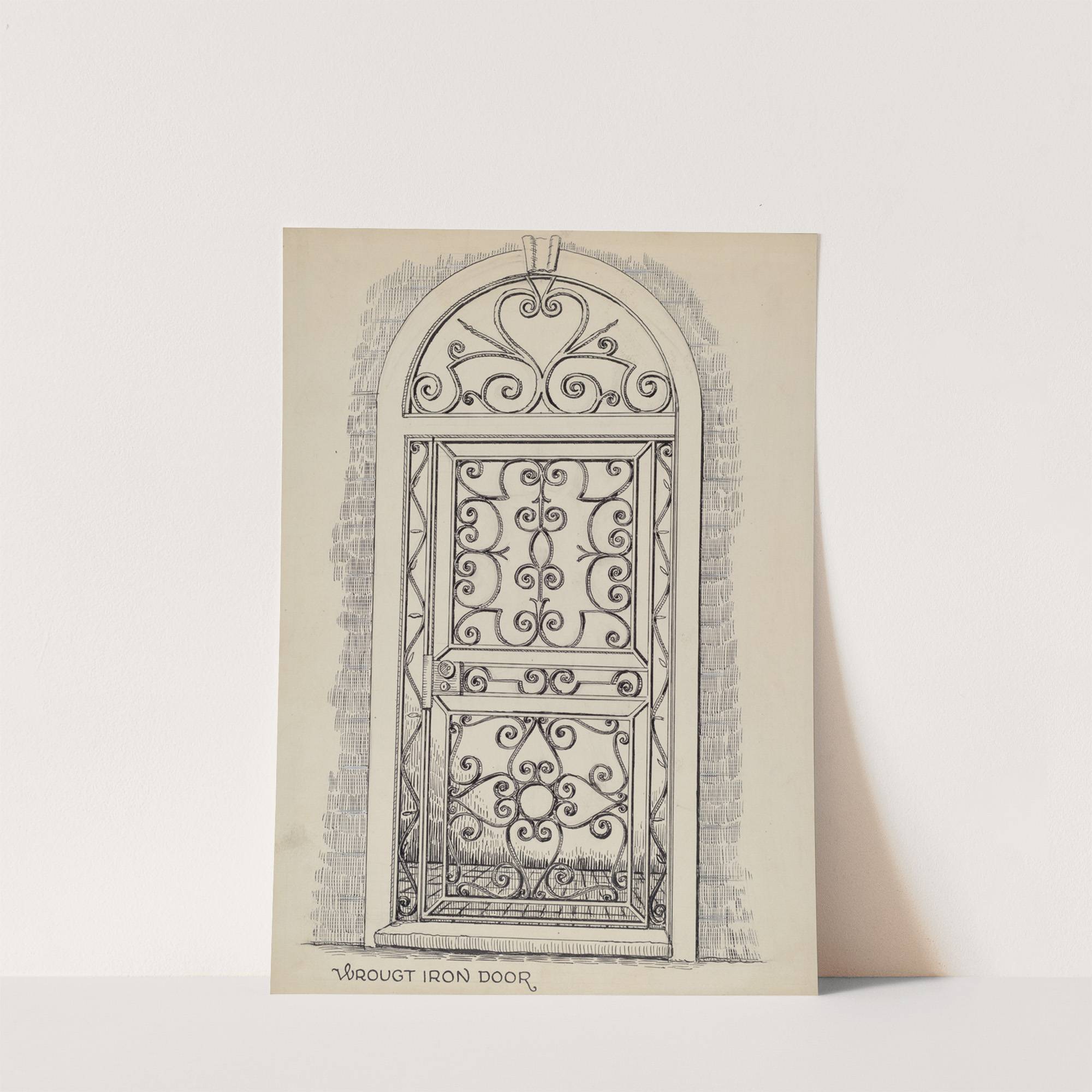 This black-and-white line drawing features a classic wrought iron door, rendered with meticulous detail in a traditional pen-and-ink style. The door is framed by an arched top, accentuating the intricate scrollwork that adorns both the upper and lower panels of...